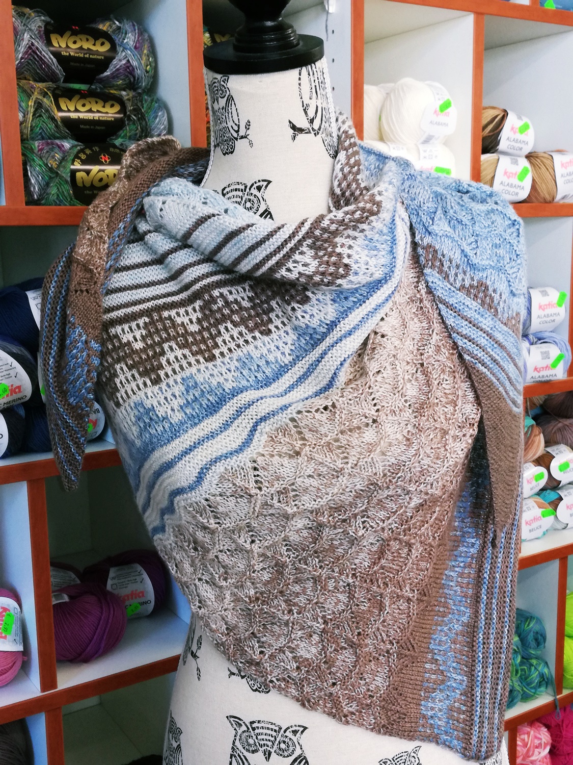 Ich finde Farbverläufe total klasse, stelle aber inzwischen auch fest dass die Tücher immer wieder ähnlich wirken. Unterschiediche Muster die mit den sanften Verläufen toll wirken, aber sonst immer wieder ähnlich aussehen. Deshalb versuch ich inzwischen die Verlaufsbobbel immer wieder anders zu verstricken, mit mehrfarbigen Mustern trotz Verlaufsgarn. Weil die Verläufe ja meist total harmonisch sind ist auch so ein Mustertuch trotzdem harmonisch obwohl mit mehreren Farben gestrickt.