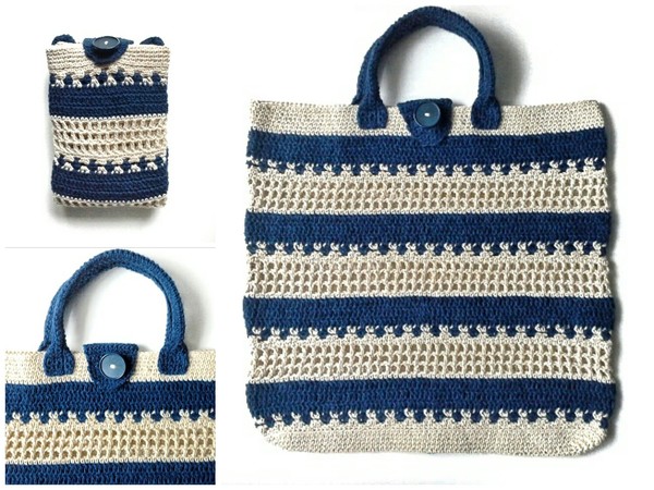 Das Muster ist sehr vielseitig, man kann die Tasche aus dicker oder dünner Baumwolle stricken, man kann sie einfarbig oder mehrfarbig stricken, und sie lässt sich auch leicht in der Größe anpassen. Alles ist in der Anleitung erklärt.