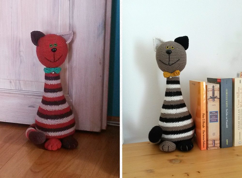 Hallo ihr Lieben! Unsere Namen sind Lenny und Leana und wir gehören der äußerst seltenen Rasse der Schlenkerlöwen an. Wir werden sitzend ca. 17 cm groß und in voller Länge mit Beinen 30 cm groß. Wir sind wirklich sehr verschmust, stubenrein und handzahm :-). Unsere Mama sagt, wir sind leicht nach zu häkeln und somit auch für Anfänger geeignet.Du solltest folgendes können: Das häkeln von festen Maschen, Zu- und Abnahme von festen Maschen, annähen von Einzelteilen, Kettmaschen, Erstellen eines Fadenrings.Was du benötigst: