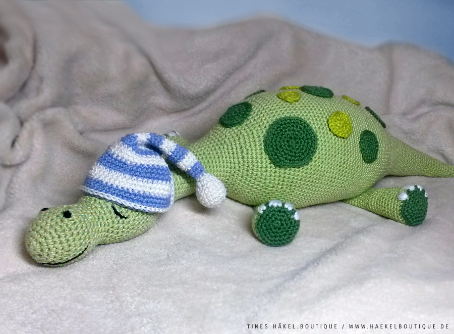 Ganze 50 cm wird er lang und ist als größeres Projekt für ambitionierte Häkelanfänger mit Grundkenntnissen geeignet. Die Anleitung erklärt ausführlich und mit vielen Bildern, wie man den Schlummerdino ganz einfach nachhäkeln kann. Übrigens: Diese Anleitung gibt es auch zusammen mit dem Baby-Schlummerdino als 2-in-1 Sparpaket "Schlummerdino-Familie" in meinem Shop.