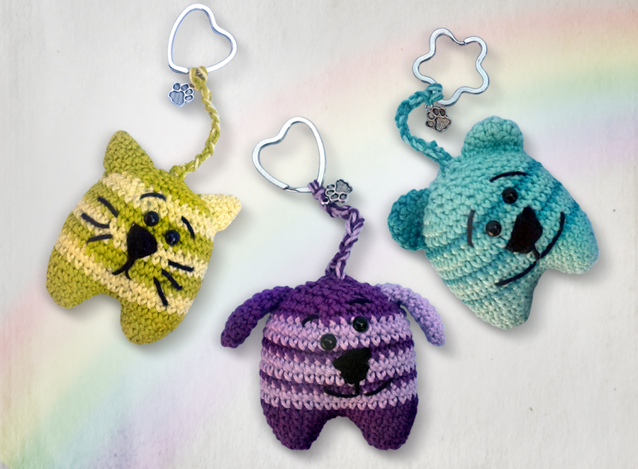 Ob als bunter Hingucker für den eigenen Schlüsselbund, als nettes Mitbringsel oder kleine Aufmerksamkeit: die Mini-Tinis sind fröhliche, kleine Gesellen, die du wahlweise als Bärchen, Kätzchen oder Hund häkeln kannst.
