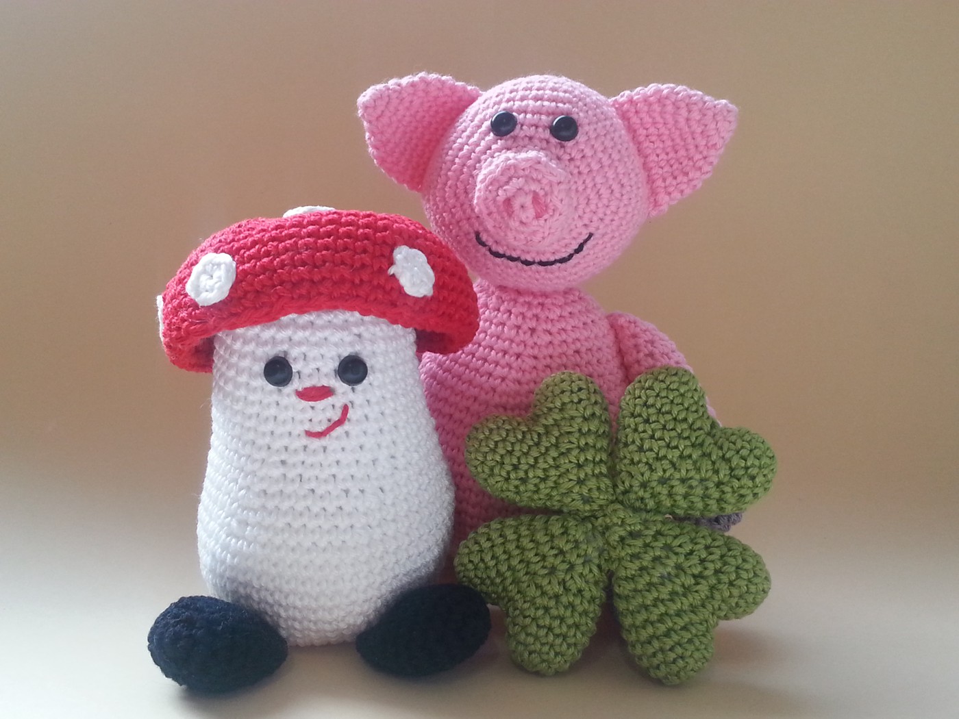 Unter Verwendung des angegebenen Materials und der Nadelstärke werden das Schweinchen 16 cm hoch, der Pilz 11 cm hoch und das Kleeblatt hat einen Durchmesser von 9 cm. Ich persönlich empfehle für das Nacharbeiten all meiner Amigurumis Baumwollgarn.