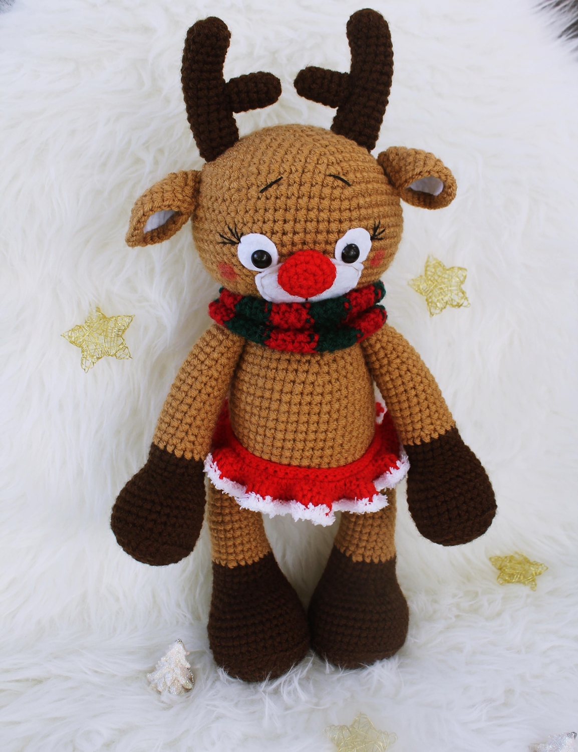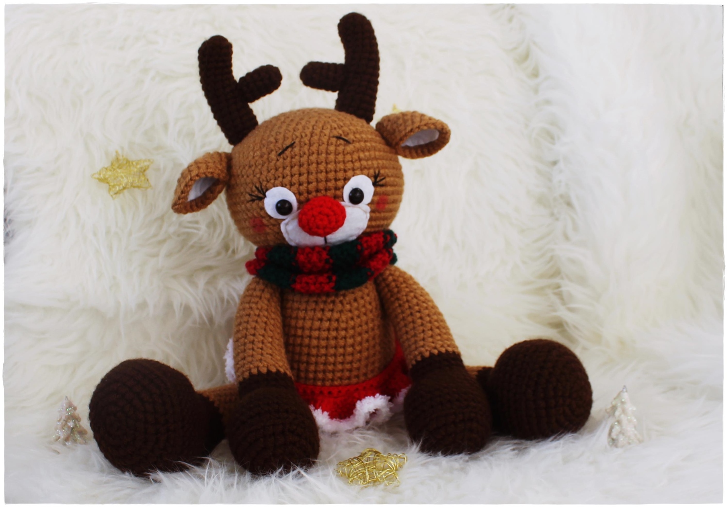 Hallo! Lass uns zusammen diese entzückende Rudolfine häkeln. Sie ist unterwegs zu einer Weihnachtsfeier und hat sich deswegen so schick gemacht.