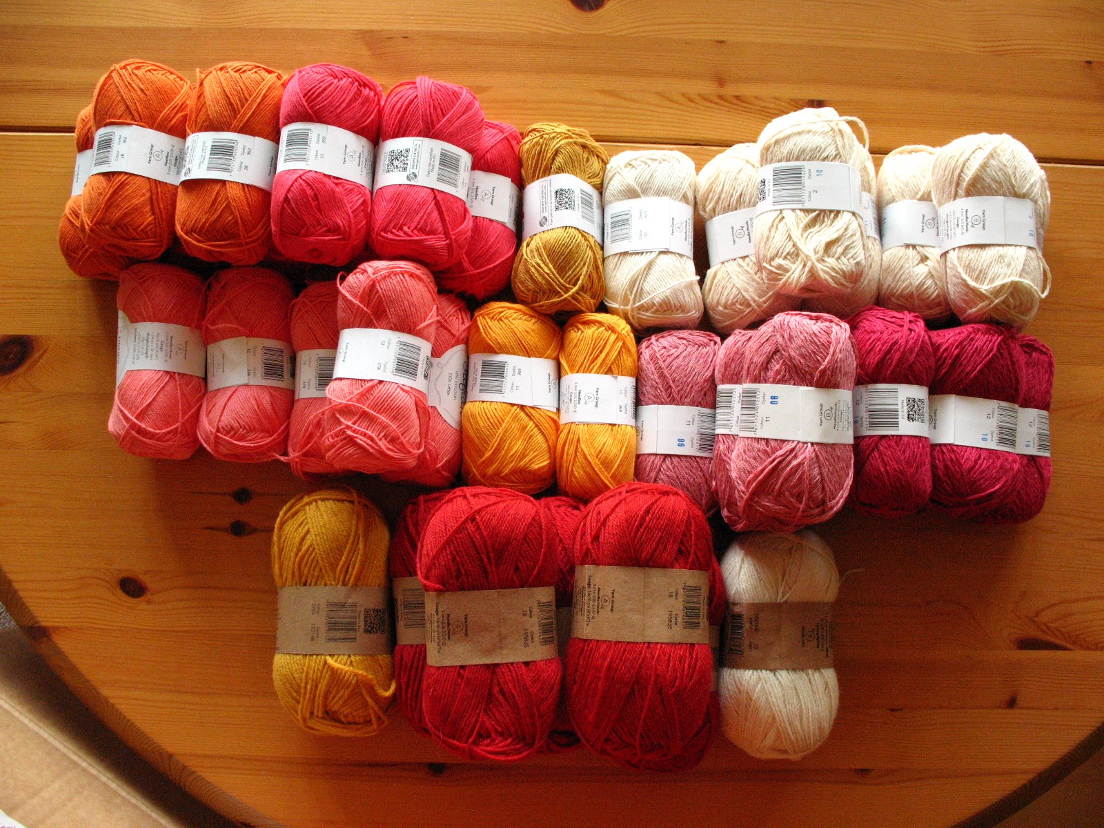 Ich wollte ja nur schwarz und weiß nachkaufen....was soll ich sagen? Dann waren da so viele wunderschöne Farben und am Ende hatte mein Mann Schnappatmung als er das Paket entgegen genommen hat.... 75 Knäuel Baumwollgarn - das war wie Weihnachten und Geburtstag auf einmal ;-)