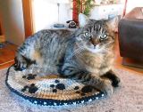 Die Katzen werden etwa 19 cm hoch und 18 cm lang bei einer Wolle in der Nadelstärke 4-5 (Lauflänge 88m) (Glitzerwolle aus dem Kaufland)