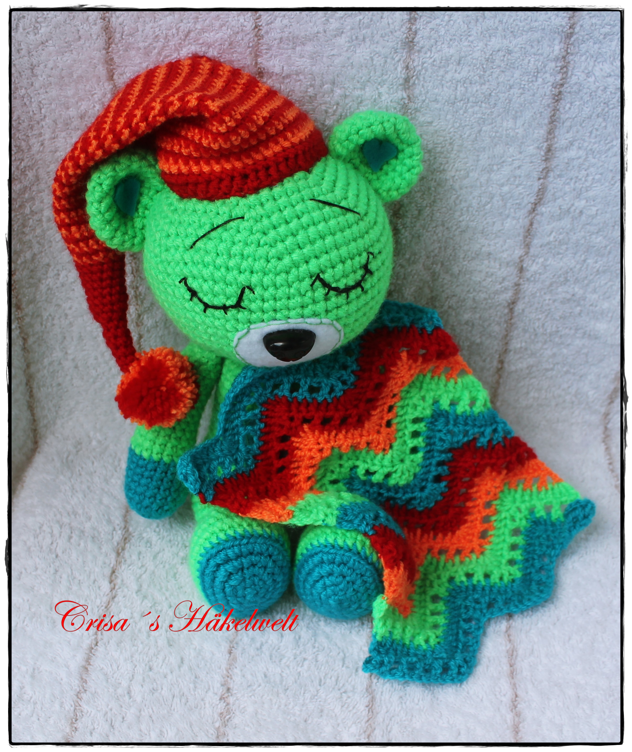 - eine Schritt für Schritt Beschreibung für den Teddybär, Zipfelmütze und die Kuscheldecke.