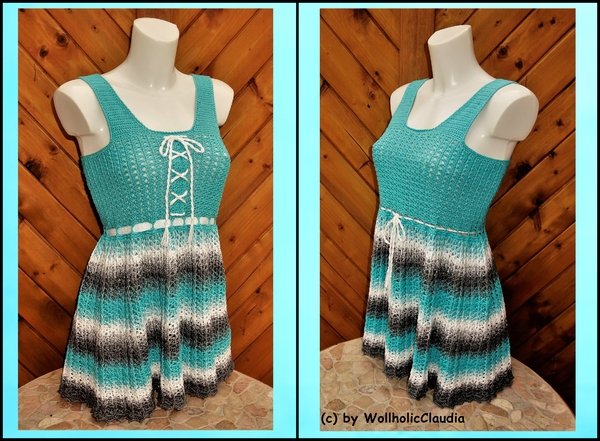 Dieses Hängerchen ist besonders schön luftig aus leichter Bobbelwolle (3fädig, 50/50, Nadelstärke 3,5 mm), aber macht sich auch toll über einem Langarmshirt und aus dicker und warmer Wolle gehäkelt.