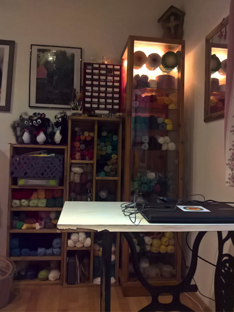 Meine Vorräte sind schon gross, Sie liegen in Regalen und in einem grossen Schrank.Ich habe sie inzwischen schon auf zwei Zimmer verteilt. Früher habe ich mir immer Wolle gekauft, wenn sie mir gefallen hat. -  Wenn ich jetzt etwas davon machen will, reichen diese Vorräte meistens nicht oder die Farbe ist nicht passend.