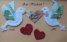 Die beiden gehäkelten Hochzeiter bieten in ihrem Inneren Platz für ein Geldgeschenk oder einen Gutschein. Das Geheimnis: beiden Figuren werden um eine Überraschungsei-Hülle gehäkelt. In der Mitte kann man die Figuren öffnen und die Überraschung entdecken.Um sie zu häkeln genügen ein paar Reste.