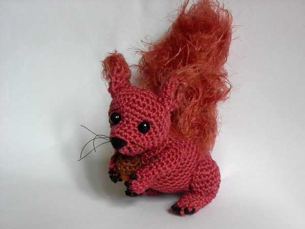 Es ist ca 14 cm groß und einfach zu häkeln (nur feste Maschen!). Der Körper wird aus rotbrauner Baumwolle mit der Lauflänge 125 m / 50 g (z. B. Catania) gehäkelt, der buschige Schwanz und die Ohrenspitzen sind mit Fransengarn  (Lauflänge ca 85m / 50g) gehäkelt.