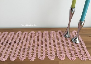 Der Tischläufer in Brügger-Spitzen Häkeltechnik, Grösse: 110 cm x 28cm Dieser lässt sich schnell häkeln, hat die Schwierigkeitsstufe leicht und sollte für einen Anfänger kein Problem darstellen. Folgende Grundkenntnisse im Häkeln sollten vorhanden sein: • Luftmasche • ganzes Stäbchen. Für den Tischläufer werden benötigt: