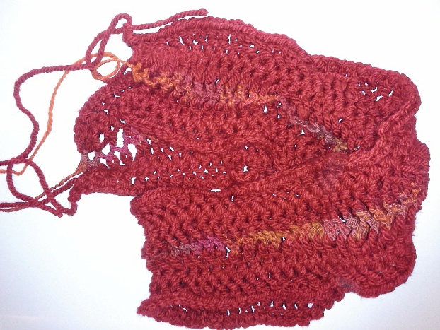 Habe zwei Stränge mit der Gabel gehäkelt und mit einem anderen Garn un der Mitte längs zusammen gehäkelt. An den Außenkanten je eine Reihe feste Maschen, dabei immer die Schlaufen einmal gedreht, die legen sich aber auch schon von alleine über Kreuz.