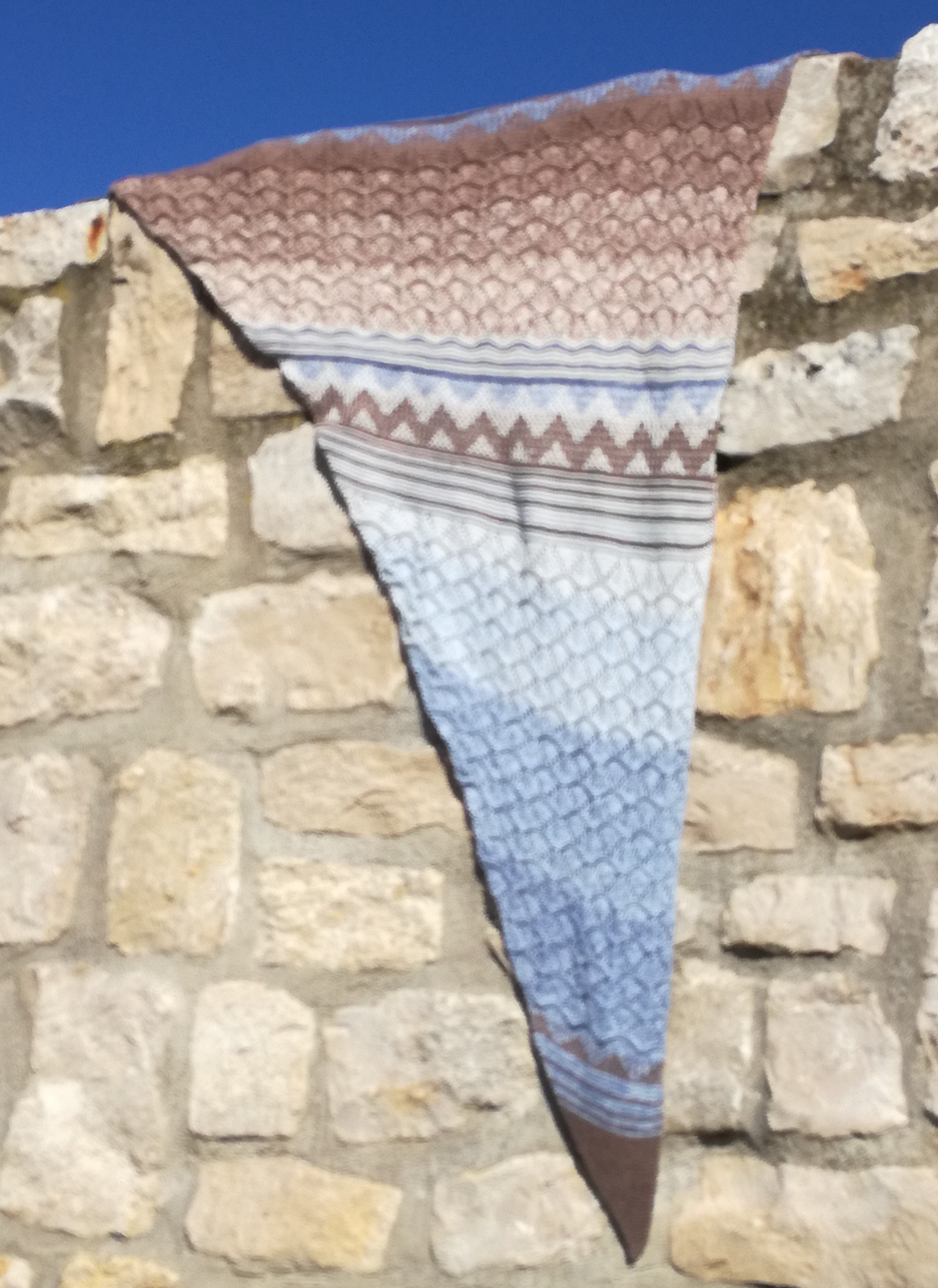 Es lässt sich einfach und abwechslungsreich aus einem Farbverlaufsbobbel stricken. In allen Farbkombinationen die ich bereits sehen durfte wirkt das Tuch einzigartig und exklusiv und nur wenige halten es für möglich dass es aus nur einem Bobbel mit ca. 900 metern Lauflänge gestrickt werden kann.