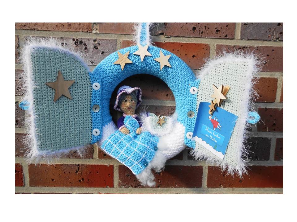 Maßband, Schere, Woll-Nadel zum Vernähen, 2 Zierknöpfe.