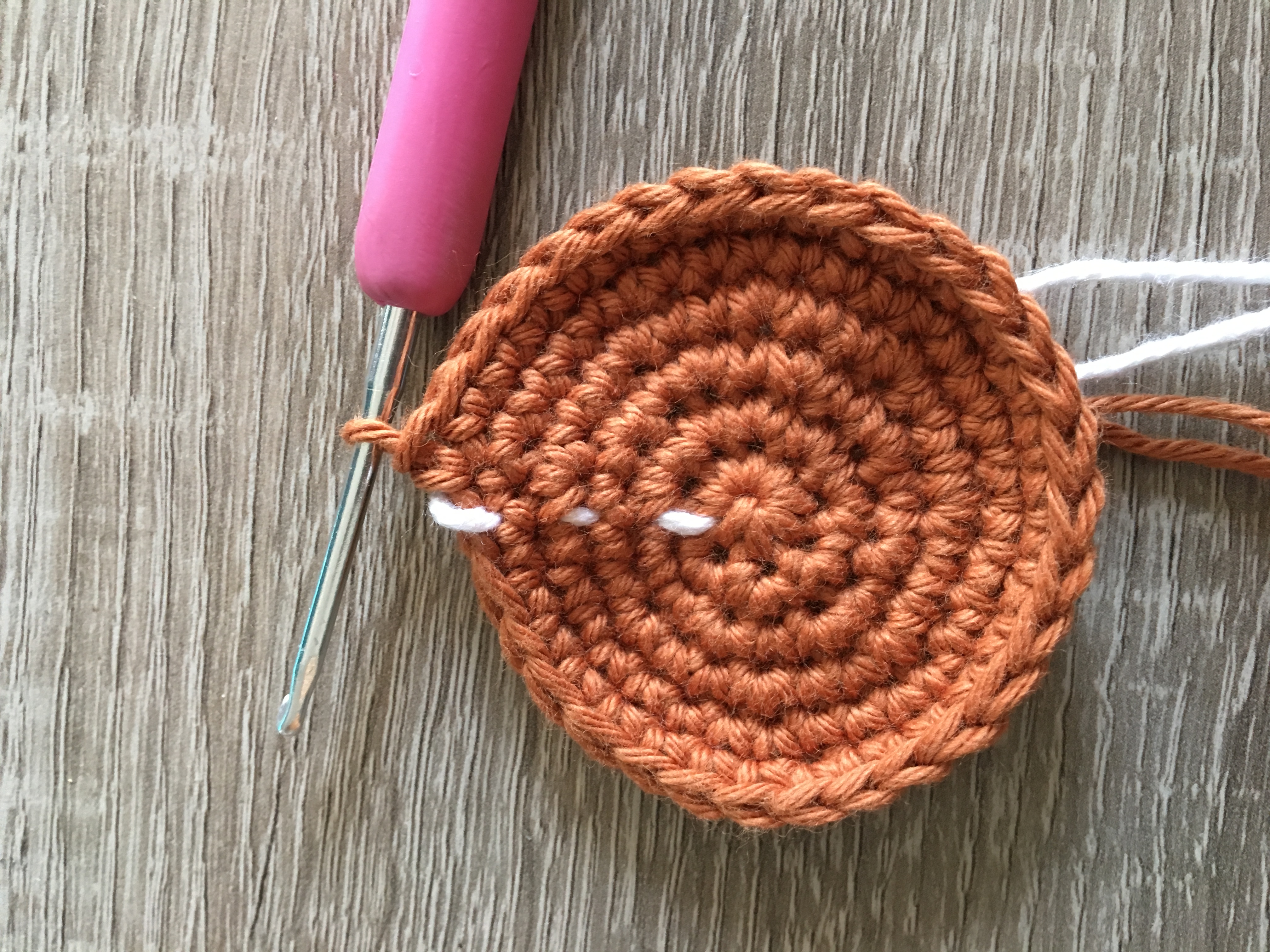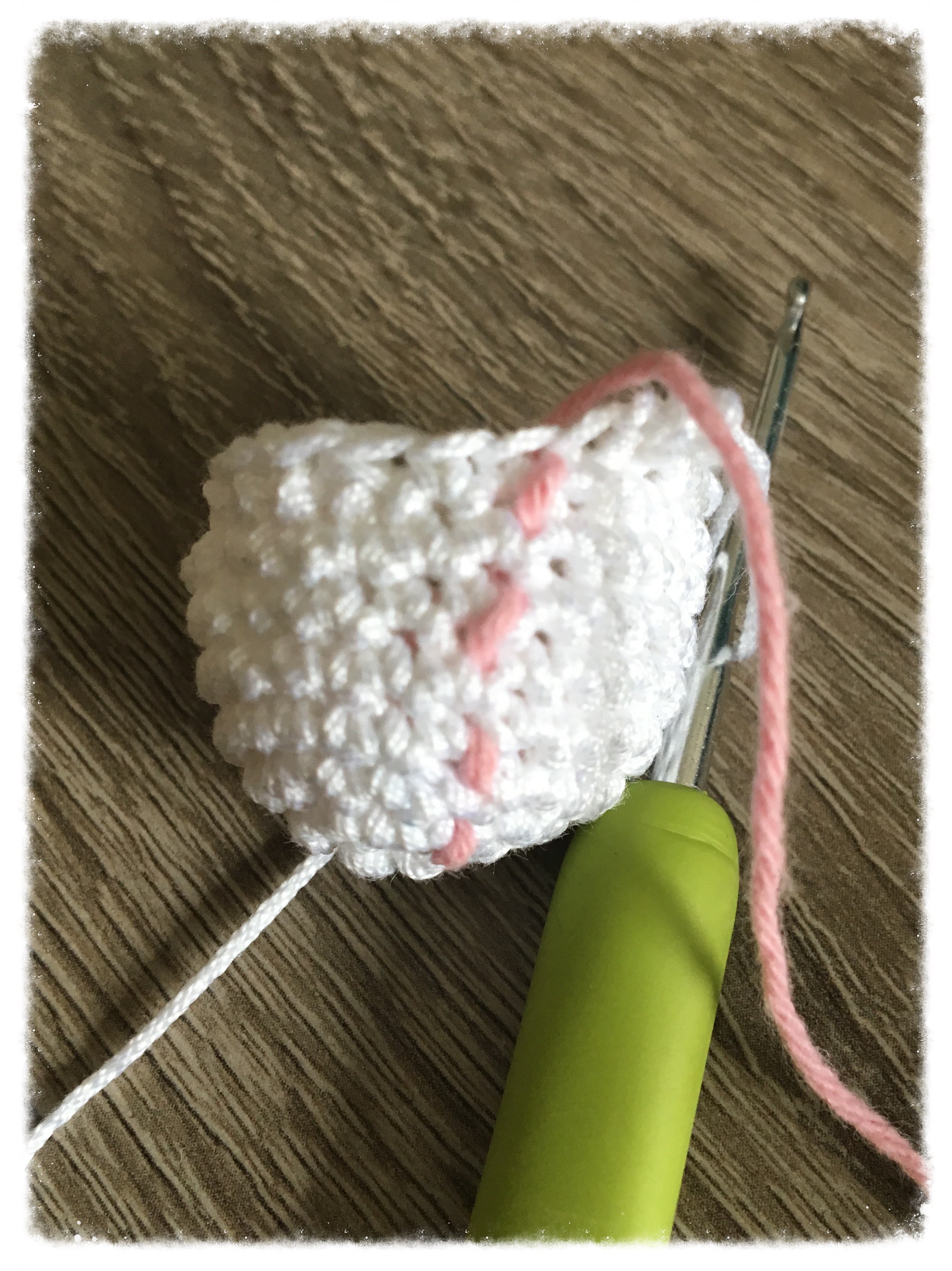 Häkelarbeiten markiere ich immer mit Fäden in Kontrastfarbe. Da sollte man die Fäden aber nicht zu kurz machen, da sie sich sonst schon mal rausziehen.