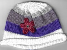 Die Mütze ist auf zwei Nadeln gestrickt, so ist sie für Anfängerinnen leicht zu stricken. Sie kann natürlich auf einem Nadelspiel gestrickt werden.Material 30 g Babywolle weiss, ein Rest violette, 1 Rest blau, kleiner Rest graue Wolle, Dazu ein 1 Nadelspiel Stärke 3,0. Sie brauchen noch eine Applikation.