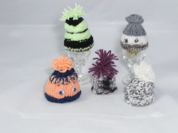 Die abgebildeten Eierwärmer sind mit Nadel Nr. 3,5 aus Baumwollgarn mit festen Maschen gehäkelt.