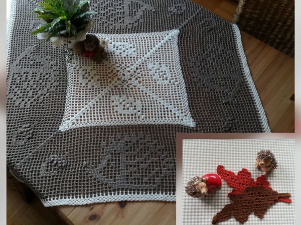 Du bekommst hier gleich zwei schöne Anleitungen für deine Herbstdeko. 1x die Mitteldecke Igel 1x das Herbstblatt in zwei VariantenDie Mitteldecke Igel hat bei mir eine Größe von 95x95cm.Sie wird in der Mitte angefangen und in einem Stück gehäkelt. Das Herbstblatt eignet sich wunderbar für Wollreste.Es hat bei mir eine Größe von 28cm Länge und 12cm Breite.Beides ist mit Schachenmayr Catania Originals und Nadelstärke 3 gearbeitet.Die Anleitungen sind schriftlich,bebildert und natürlich mit den Zählmustern.Angaben zum Verbrauch und Farben findest du auch dort.