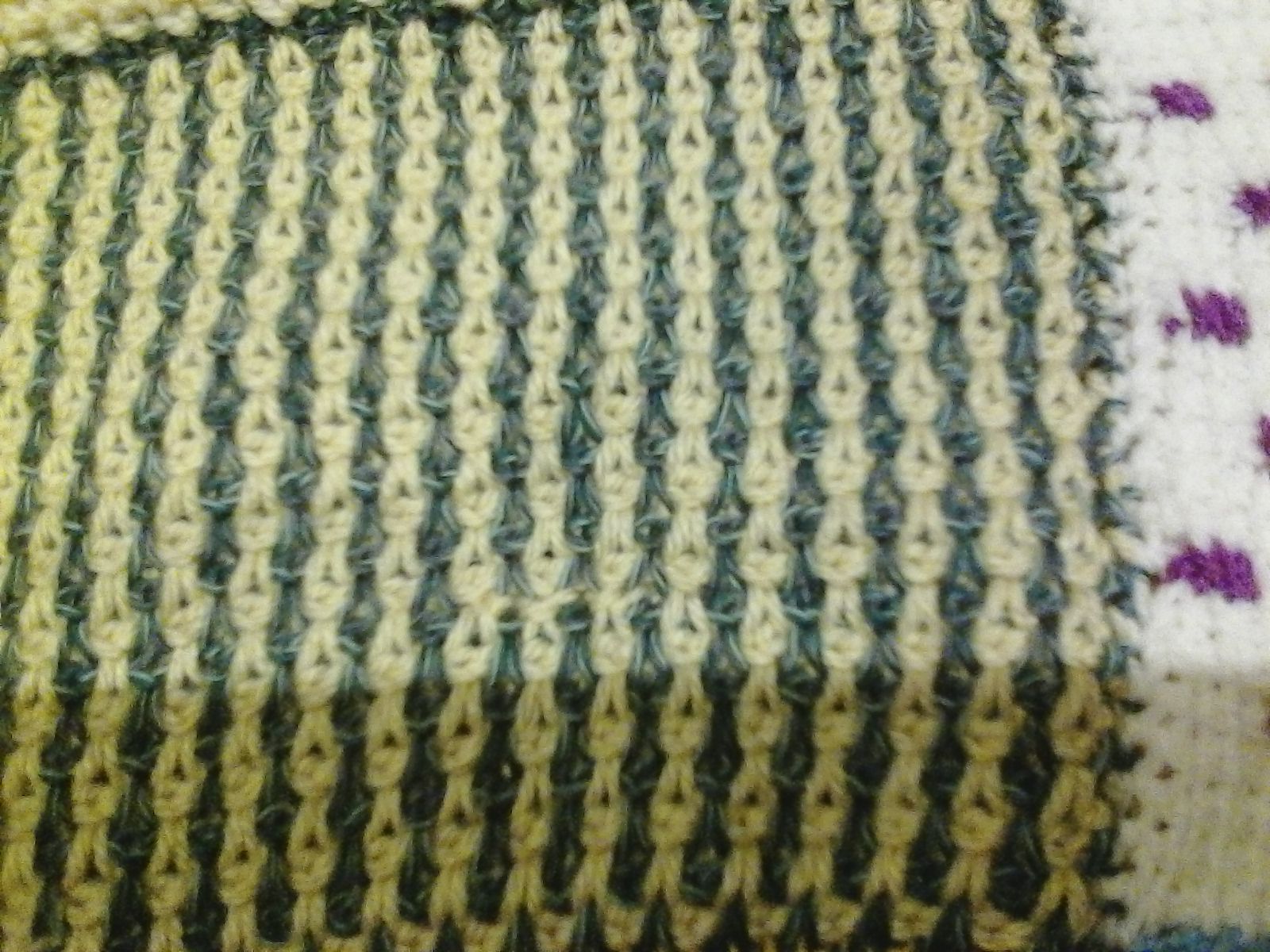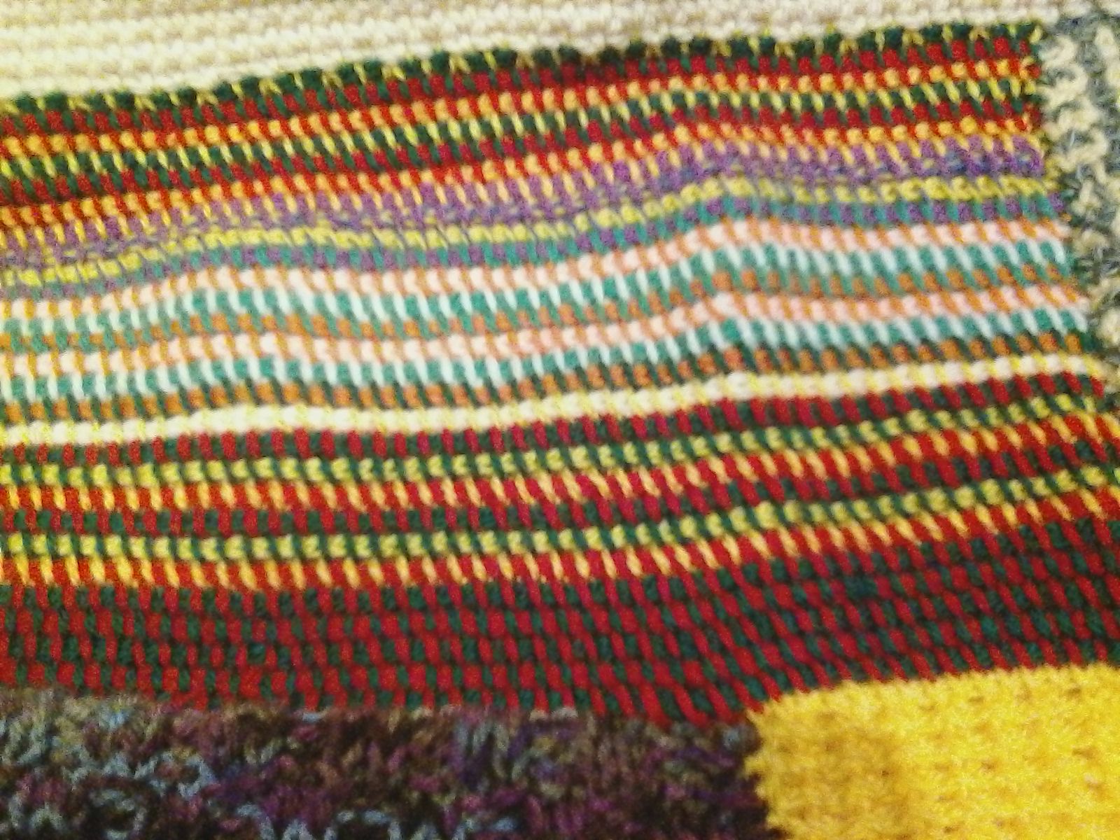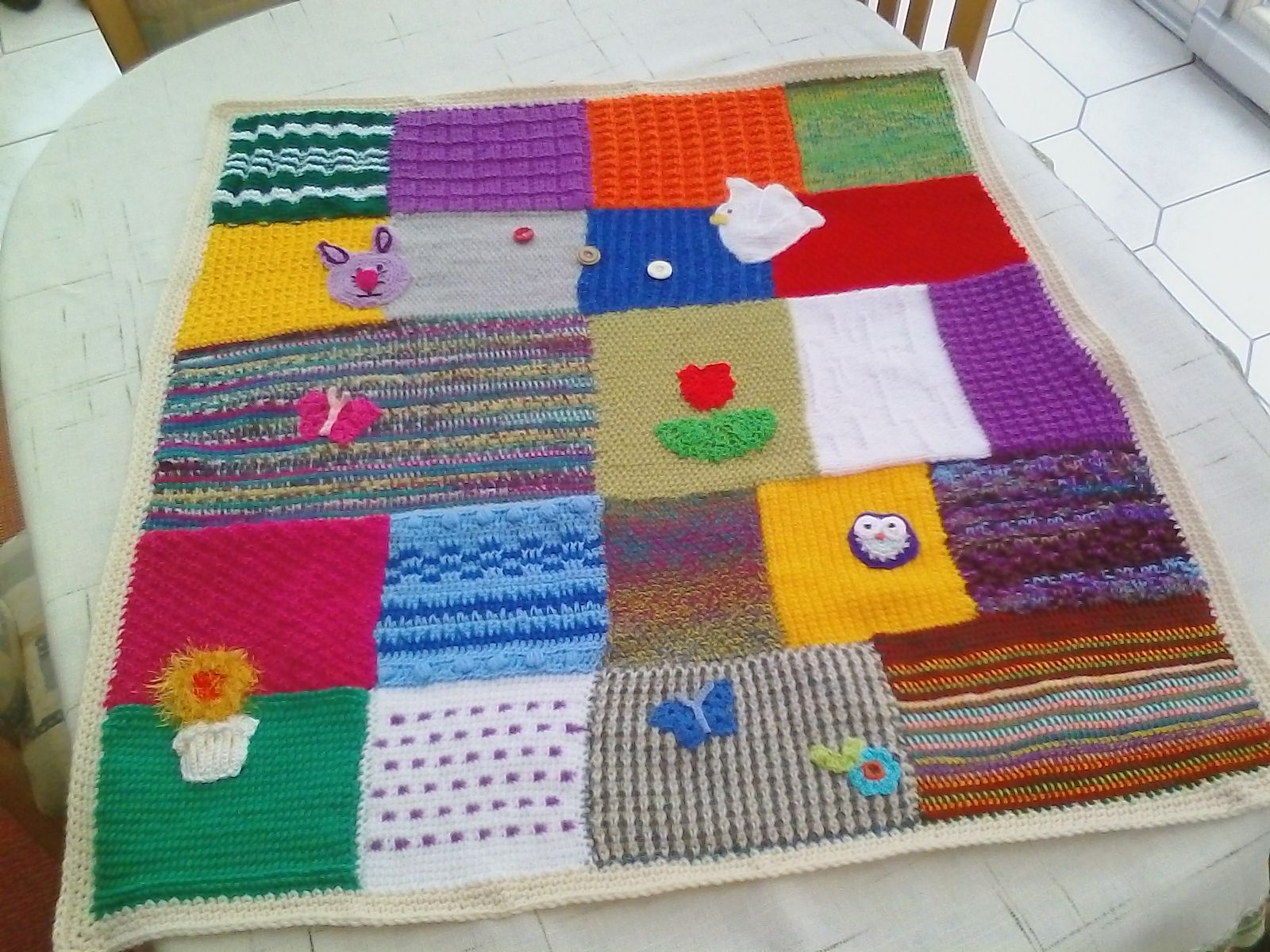 Heute bin ich mit meiner Decke fertiggeworden. Sie hat zwölf verschiedene Muster in tunesisch häkeln, der Rest ist gestrickt.