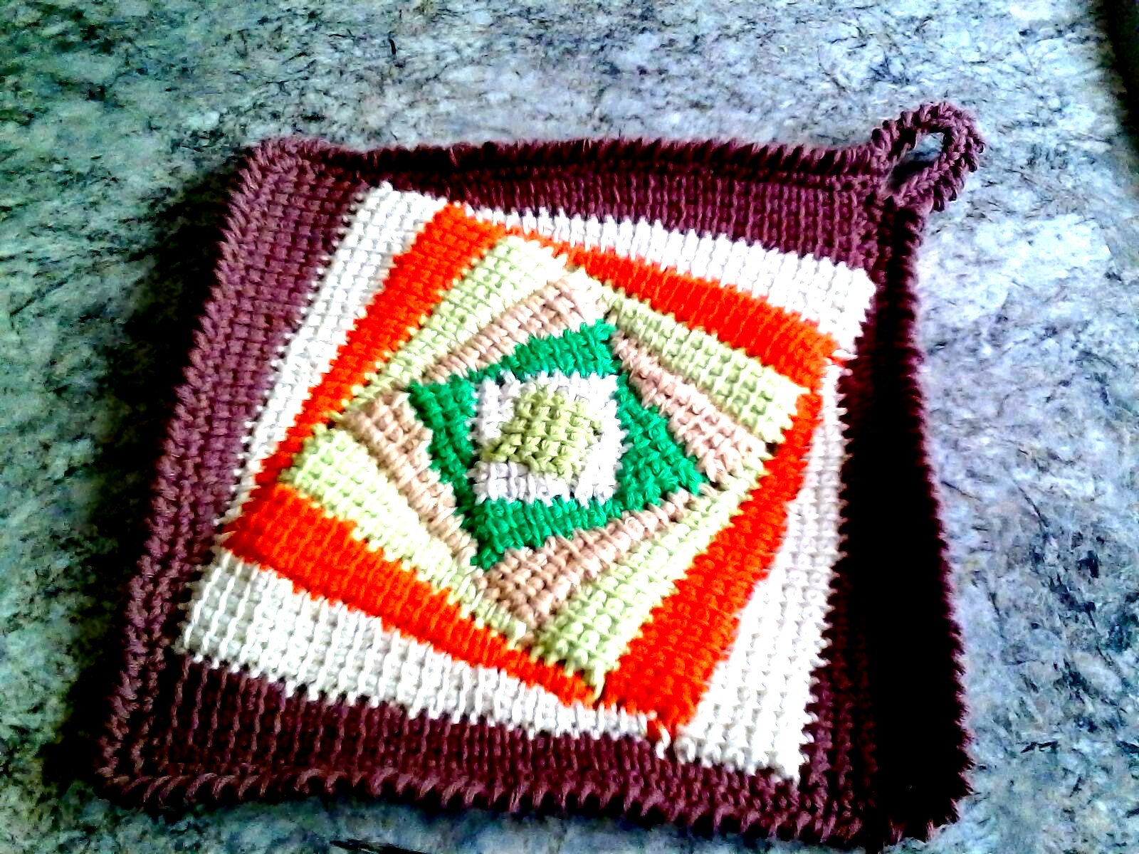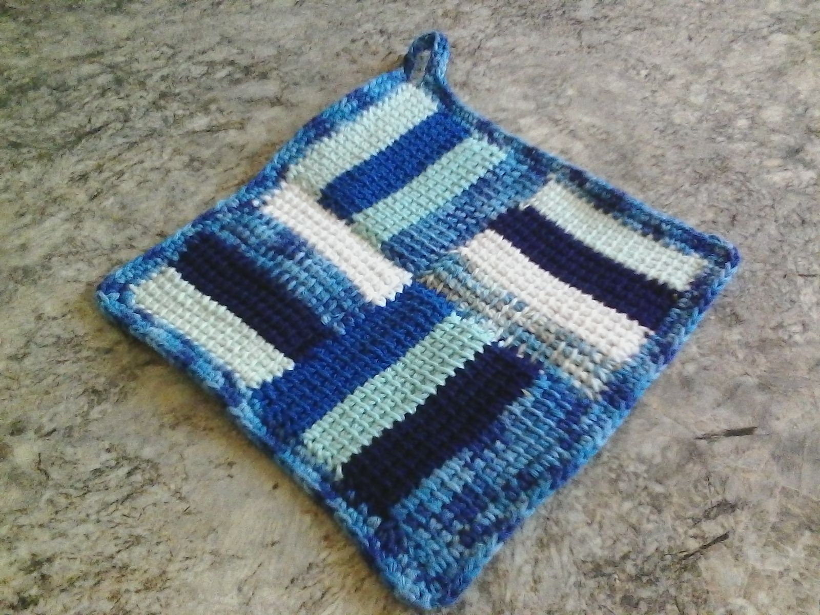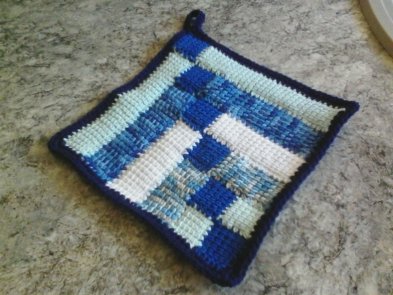 Heute bin ich mit meiner Decke fertiggeworden. Sie hat zwölf verschiedene Muster in tunesisch häkeln, der Rest ist gestrickt.