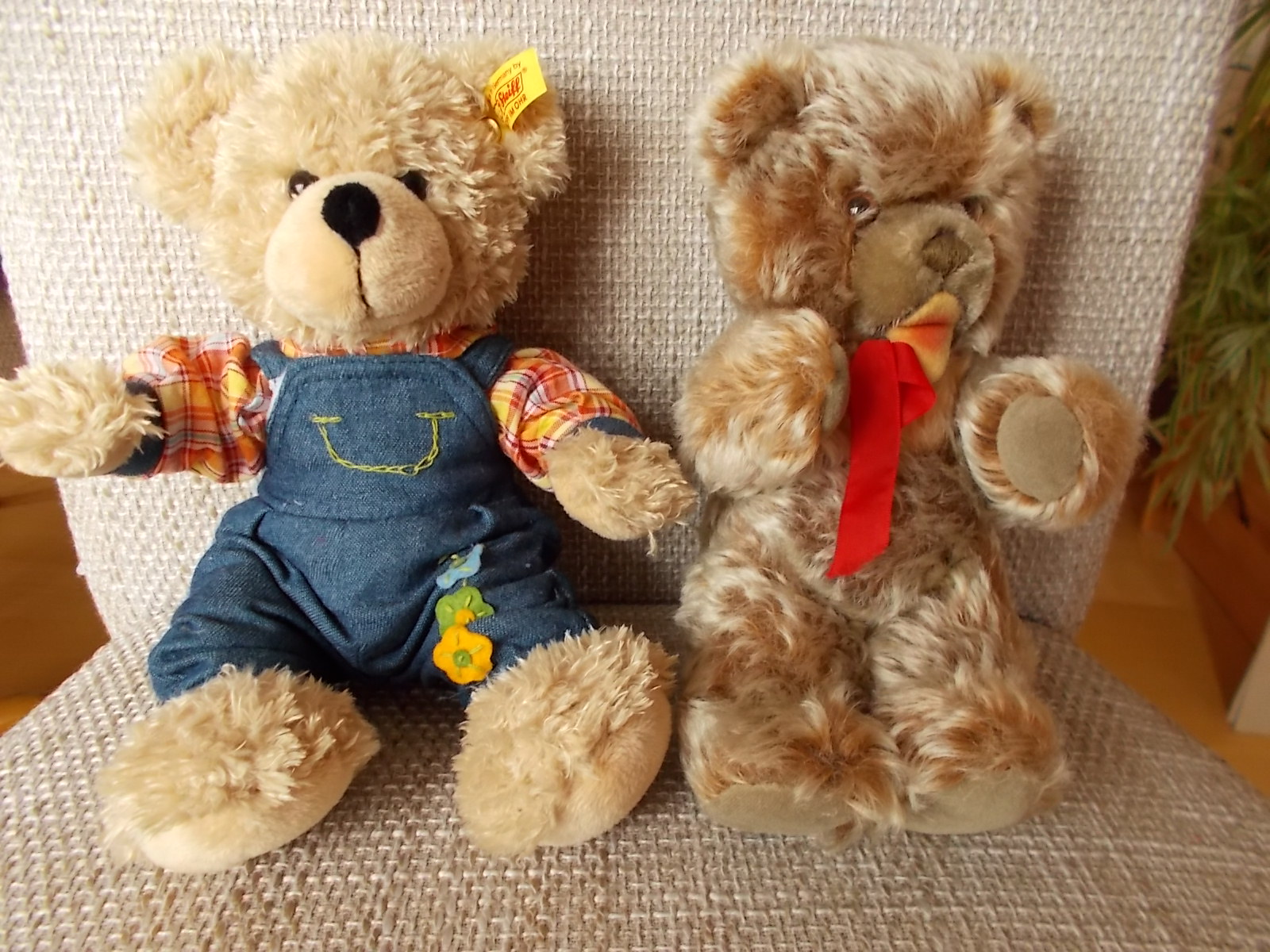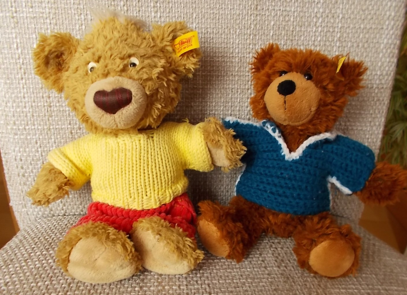 Christina, ich hab mir meine Bären mal so angeschaut ... ui, da kommen auch eine Menge zusammen. Die kleineren sitzen überall verteilt. Im Schlafzimmer hab ich zwei und im Wohnzimmer sitzen meine vier Steiff-Bären und noch einige andere. Hier ein Foto von den Steiff-Teddys. Sie haben teilweise Pullis an, die ich vor 40 Jahren meinem Sohn für seine Bären gestrickt bzw. gehäkelt habe. Jetzt wird es Zeit für was Neues.