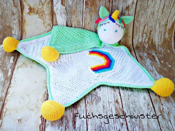 Der kleine, kuschelige Einhorn wird zum treuen Begleiter, Tröster und Einschlafhelfer, denn er riecht so schön vertraut nach Mama und Papa.Diesen süßen Schmusebegleiter kannst du mit Hilfe dieser Anleitung mit viel Liebe in jeder Masche selbst herstellen, die Anleitung ist sehr ausführlich auf 15 Seiten geschrieben, viele Bilder helfen dir bei der Umsetztung.Um die Entwicklung deines Babys zusätzlich zu fördern, kannst du eine Rasselscheibe in das Köpfchen einsetzen und die Hufe mit Knisterfolie füllen.