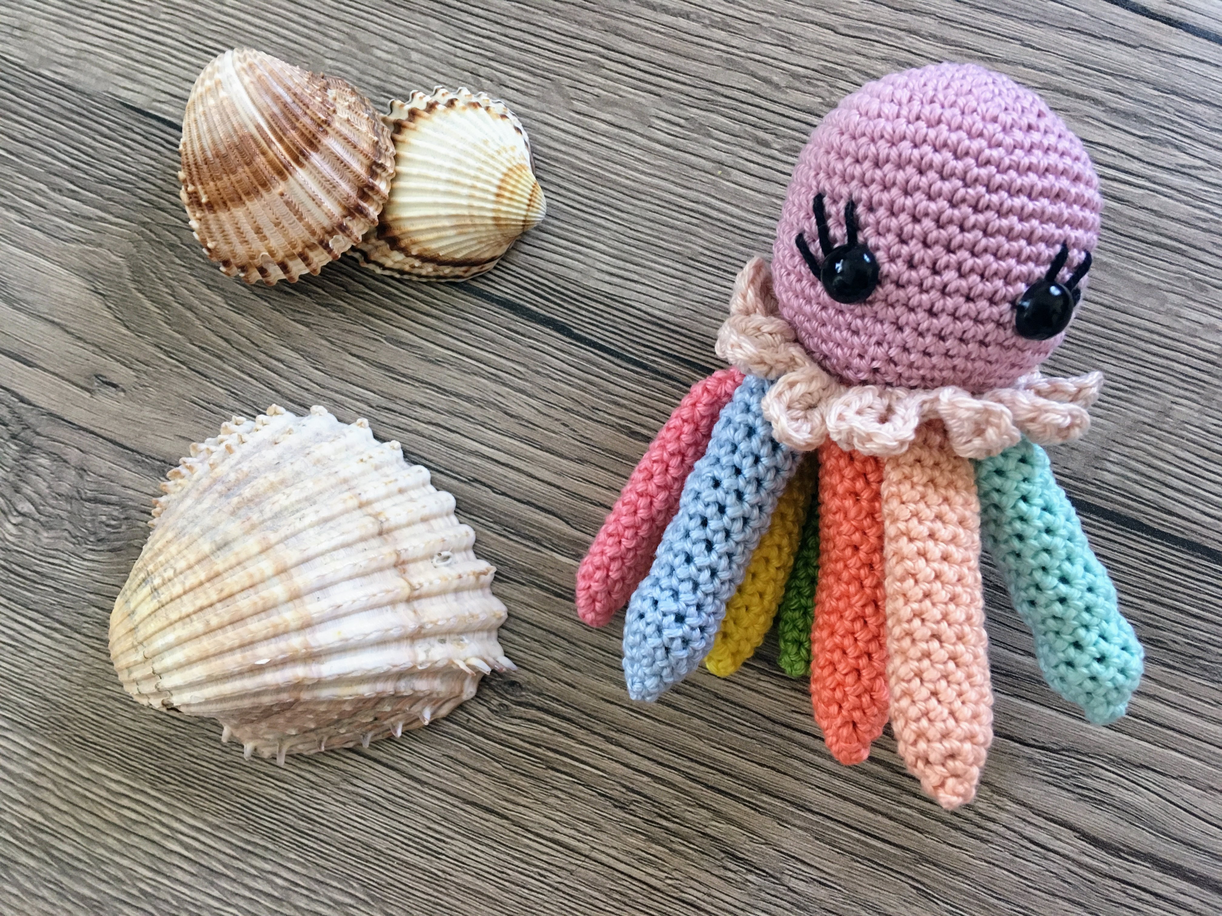 schwimmt um die Muscheln herum und lässt sich von der Strömung treiben. Es wird aus Sockengarn mit Farbverlauf und Glitzerfaden gehäkelt und wird etwa 24 cm groß.