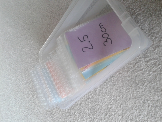 Ich hab die Plastikhüllen in denen die Stricknadeln waren aufgehoben, auf der Pappe da drin steht ja die NS und die Länge drauf. Diese sind dann nacheinander nach Stärke und Länge sortiert. Aber irgendwie ist da immer Ödnis weil die Nadeln in irgendwelchen Ufos stecken.