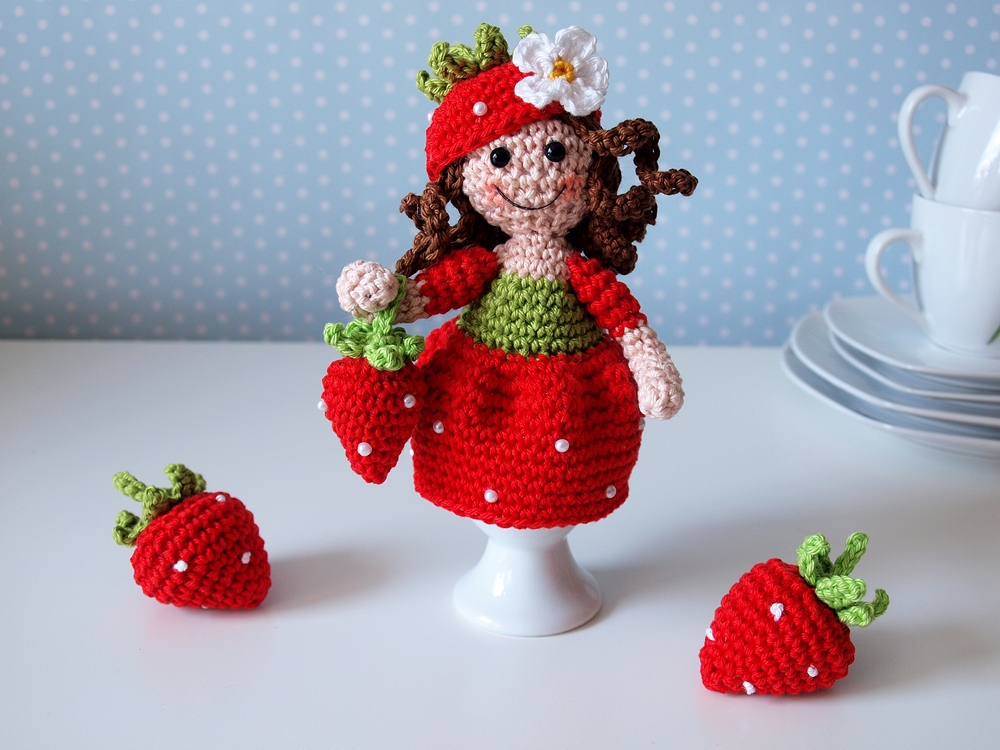 Häkelanleitung für eine Eierwärmer-Erdbeerfee inkl. kleinen und großen Erdbeeren