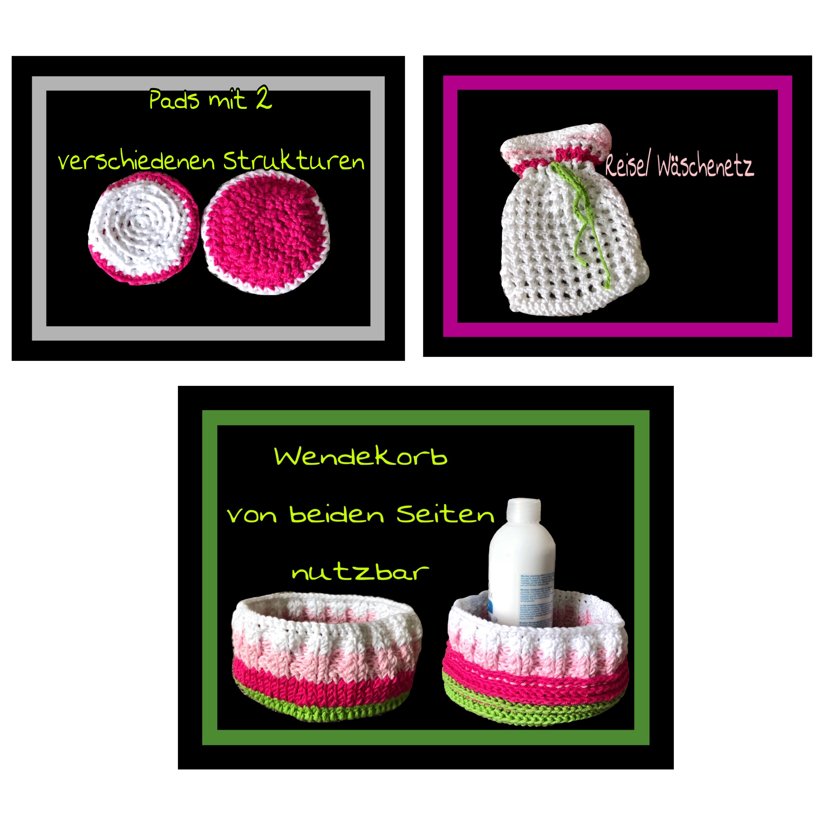 Im hübschen  Wendekörbchen lassen sich die Pads immer griffbereit aufbewahren und  unterwegs hält das Reisenetz alles schön zusammen. Das Netz kann ebenfalls als Wäschenetz verwendet werden, damit kein Pad in der Waschmaschine verloren geht.