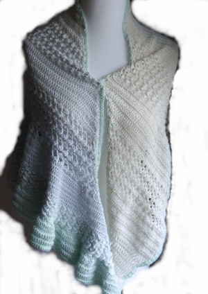 Für dieses Tuch werden ca. 300 g 3-fädiges Verlaufsgarn (50 % Baumwolle / 50 % Polyacryl) in den Farben Creme, Hellgrau und Erbse (Wunschwicklung von Traumgarne) sowie Häkelnadel Nr. 2,5 - 3 benötigt..