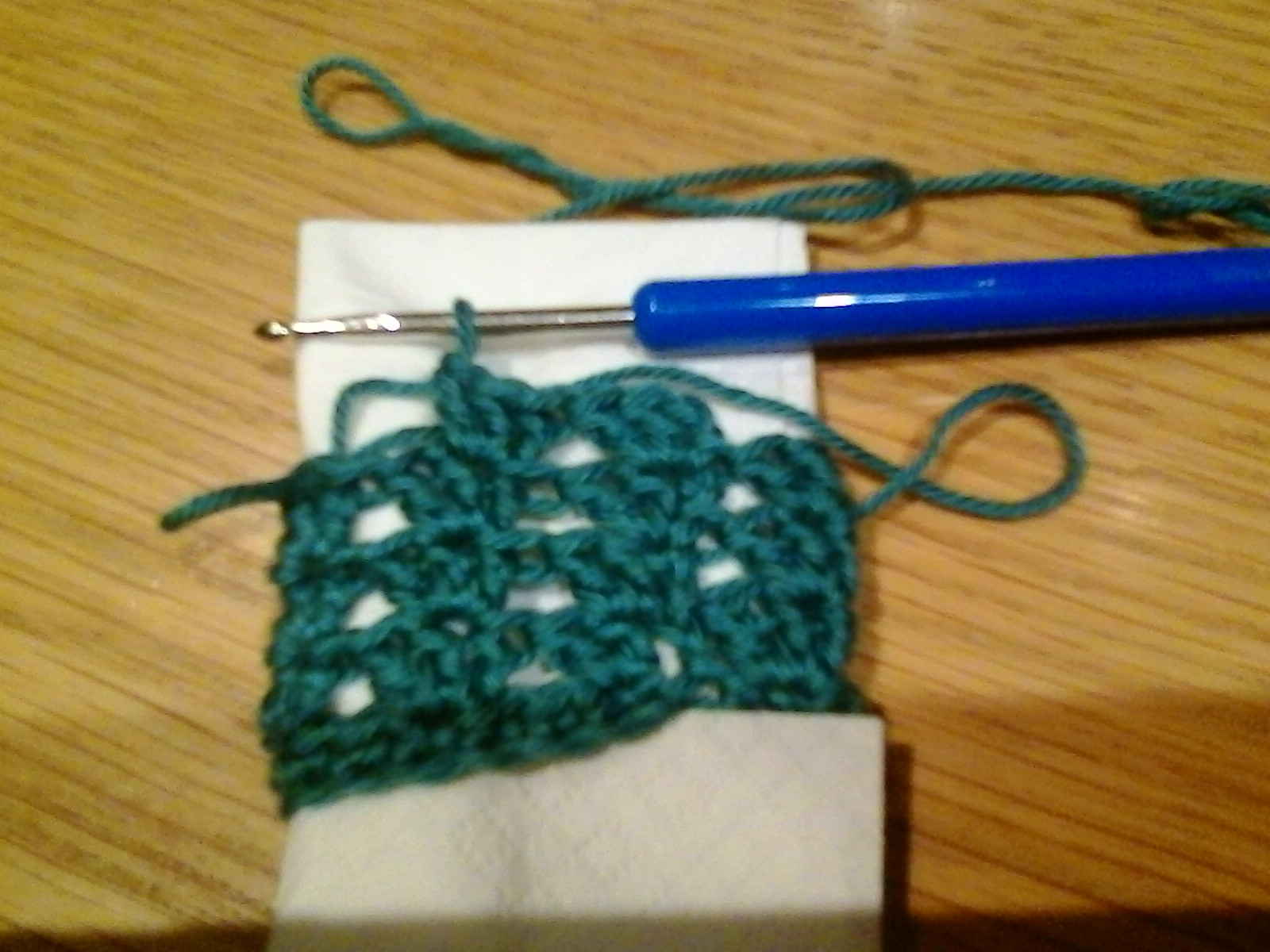 Ich habe versucht ein Stirnband nach Anleitung zu häkeln. Luftmaschenkette mit Kettmasche schließen, eine Luftmasche und dann eine Runde feste Maschen, Kettmasche in 1. feste Masche (diese Runde ist identisch mit der letzten Runde). Dann werden 4 Runden gehäkelt: beginnend mit 2 Luftmaschen und 2 Stäbchen in die 1. Masche, 2 Maschen überspringen, in die folgende Masche wieder 3 Stäbchen etc. zum Schluss Kettmasche in die obere Luftmasche.