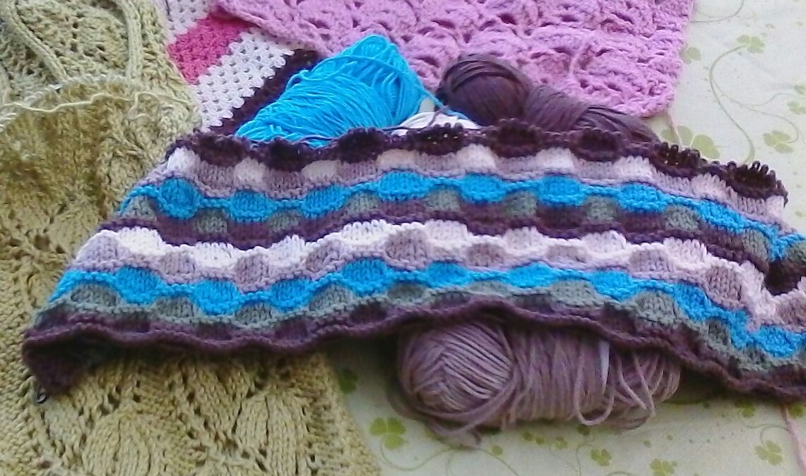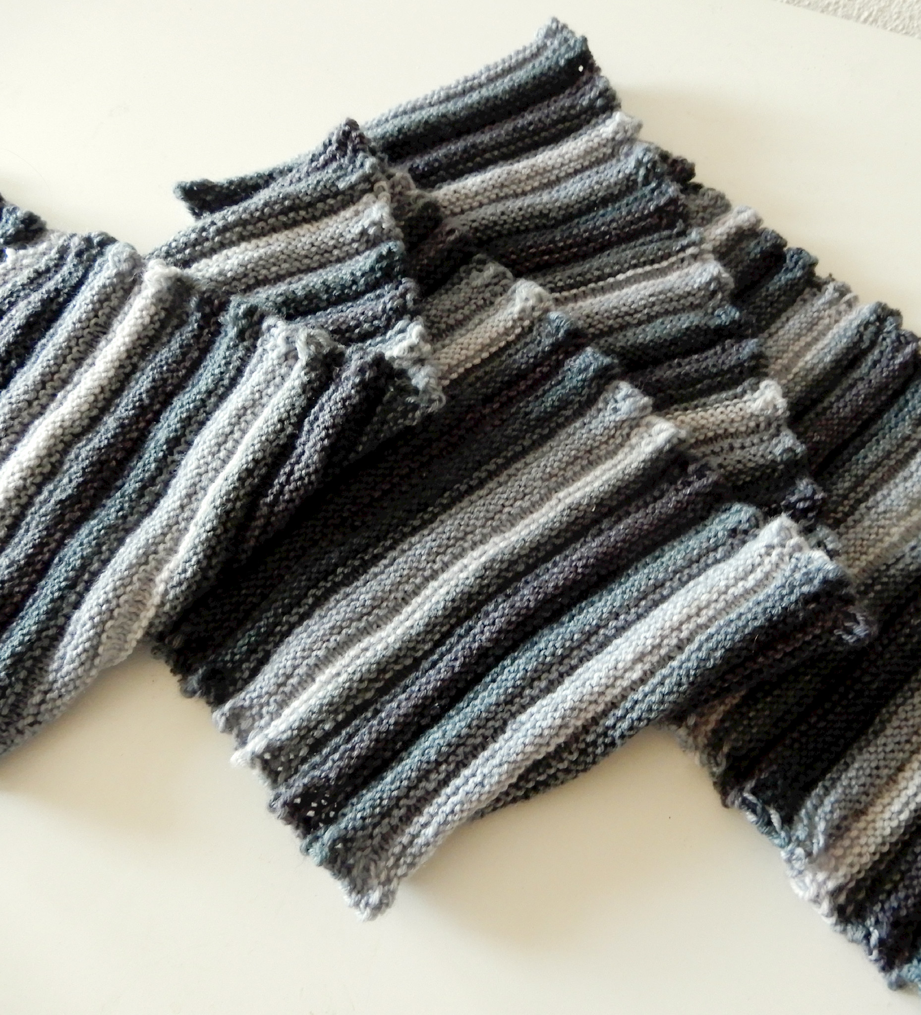 Mein anderer Schal - ich bin am Überlegen, ob ich ihn (wenn grün verstrickt ist) noch mit weiß, rosa und pink ergänze, damit er lang genug wird.