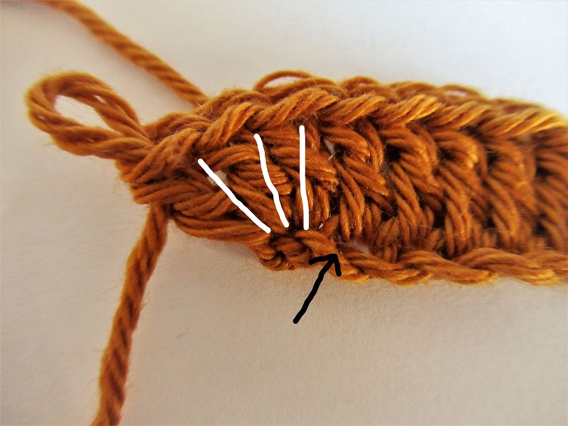 die weißen Striche sind die 3 Stb, die du in die letzte M der LM-Kette gehäkelt hast, der Pfeil zeigt, wo du auf der Rückseite der LM-Kette weiter häkeln sollst.