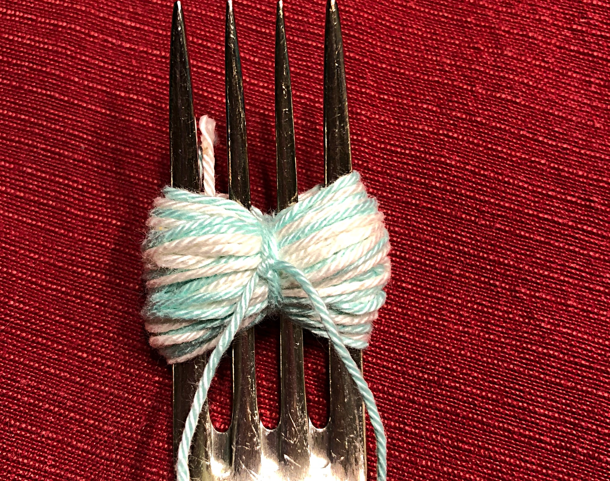 (Baum) Wolle dick um eine Gabel wickeln, einen Faden durch die mittleren Zinken ziehen und gaaanz fest verknoten. Anschließend die Seiten rechts und links der Gabelränder mit einer Schere aufschneiden. Aufschütteln und evtl etwas in Form schneiden-fertig!