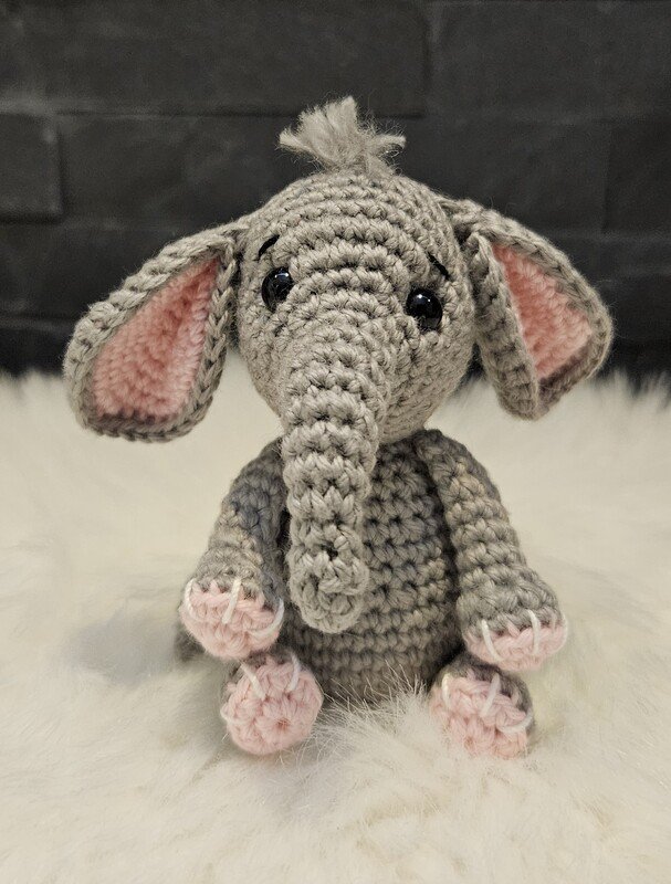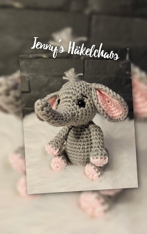Der Elefant ist ca. 11cm hoch. Die Größe variiert durch Wolle und Häkeleigenschaften (fest oder locker).