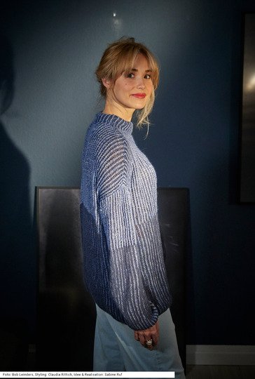 Der Oversize-Pullover mit weiten Ärmeln und überschnittenen Schultern ist nicht nur überaus bequem, sondern schillert dank des zweifarbigen Patentmusters aus dunkelblauem Schurwollgarn mit feinem Alpaka und hellblauem Garn aus Baumwolle, Alpaka, Polyamid und Schurwolle auch herrlich in Meeresfarben. Im unteren Bereich tritt Dunkelblau in den Vordergrund, im oberen Hellblau. Bis zu den Armausschnitten wird in Runden gearbeitet, danach in Reihen, wie auch die Ärmel. Für den Stehkragen wird das Patentmuster in Runden fortgesetzt. Eine Anleitung steht für die Größen 36/38, 40/42 und 44/46 zur Verfügung.