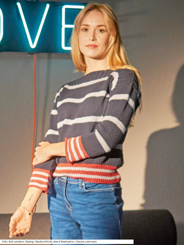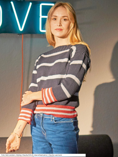 Dieser Pullover mit U-Boot-Ausschnitt und überschnittenen Schultern beweist, dass es für den klassischen Marine-Look nicht unbedingt Weiß als Zutat braucht. Die schmalen Streifen sind in zartem Hellgrau gehalten, während die breiten Streifen in Marineblau sind, dadurch wirkt der Pulli insgesamt harmonischer, weil die Farbkontraste nicht so hart ausfallen. Besonderer Hingucker: die rot-grau gestreiften 1/1-Rippenbündchen. Auch die Schulterpasse wird im Rippenmuster gearbeitet, hier als 2/2-Rippen, ansonsten wird glatt rechts gestrickt. Eine Anleitung für den Pulli aus Baumwollgarn mit Kaschmiranteil gibt es für die Größen 36/38, 40/42 und 44/46.