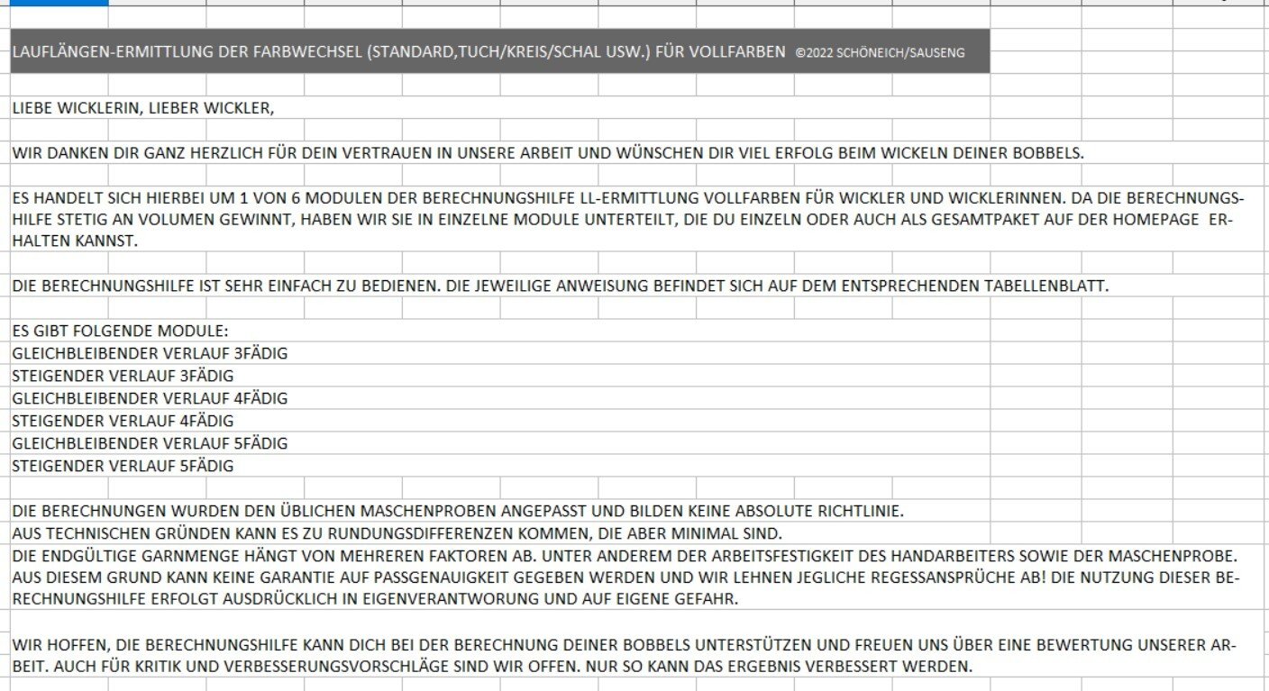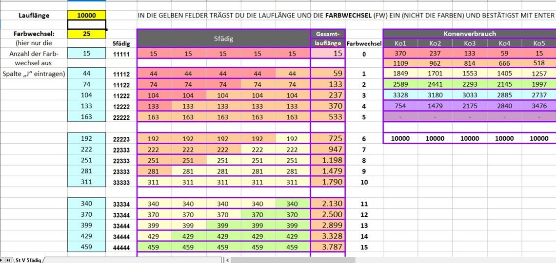 Berechnungshilfe zur Lauflängenermittlung für Farbverlaufsgarne im Vollfarbverlauf für bis zu 8 Farben, Modul: