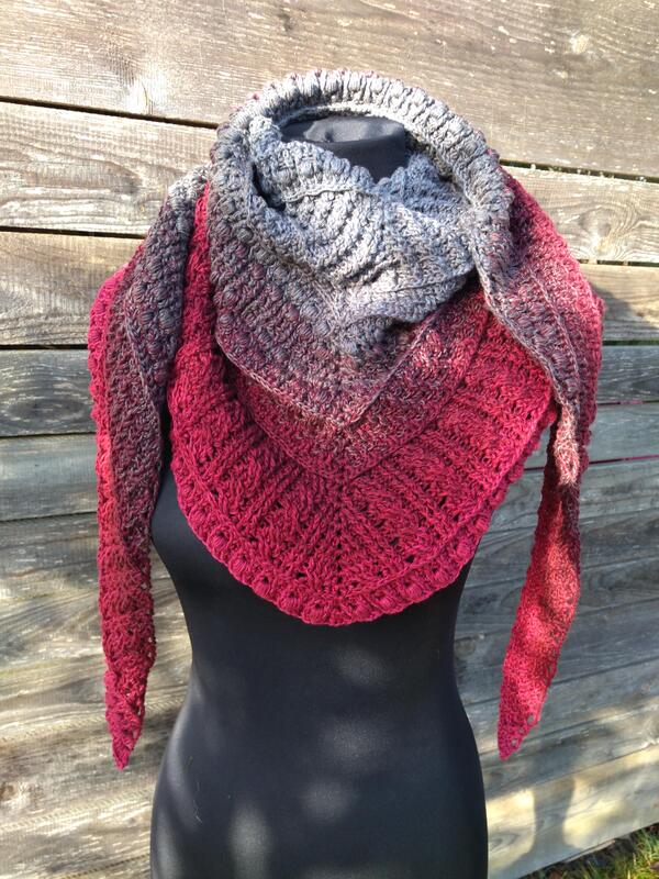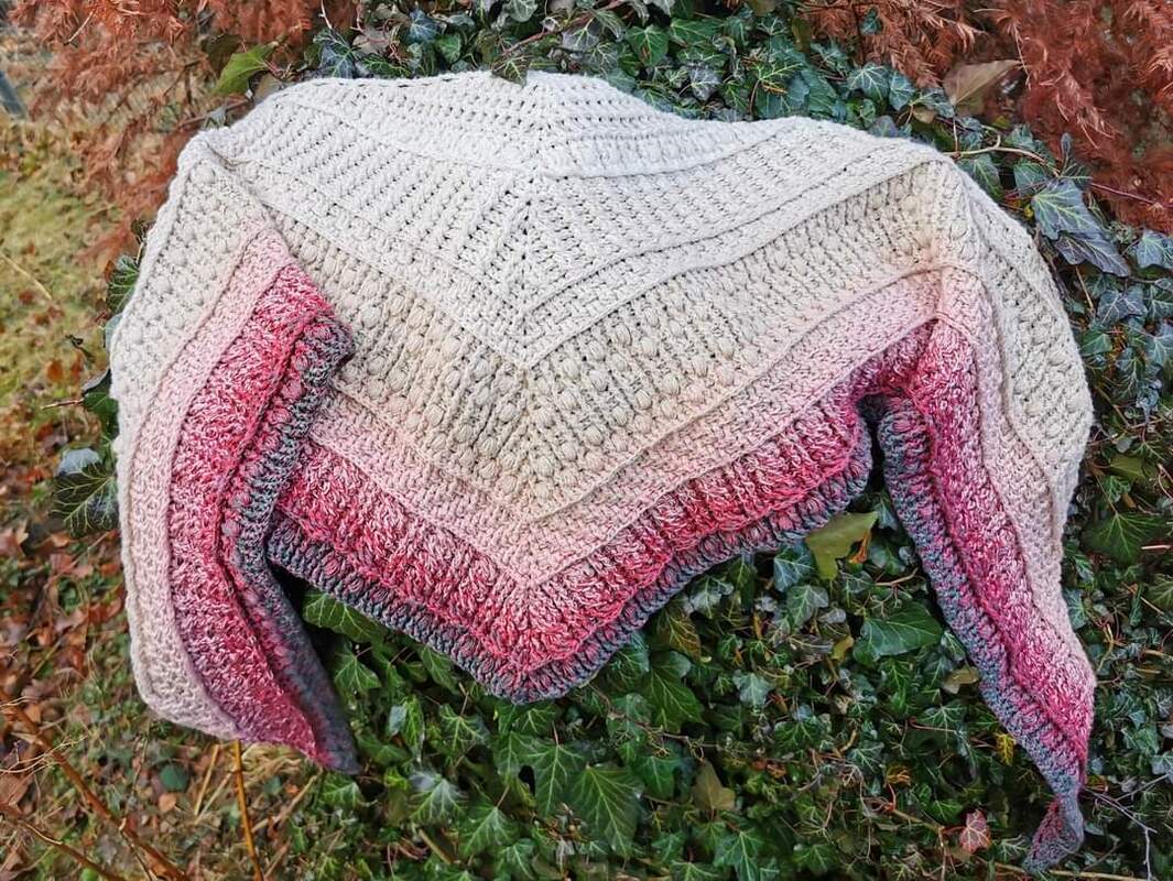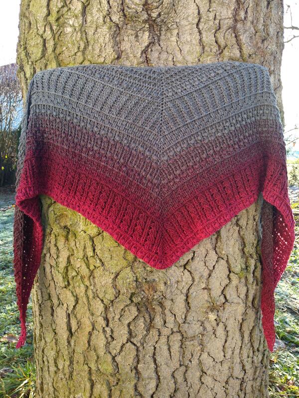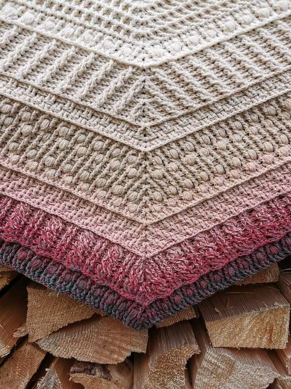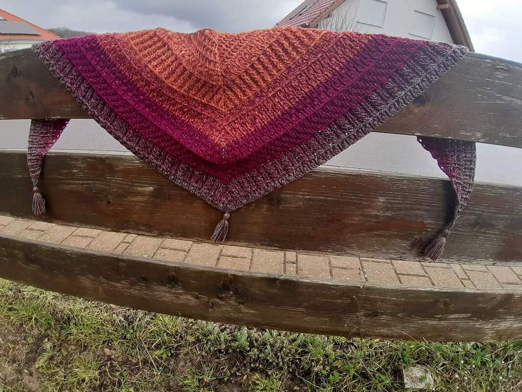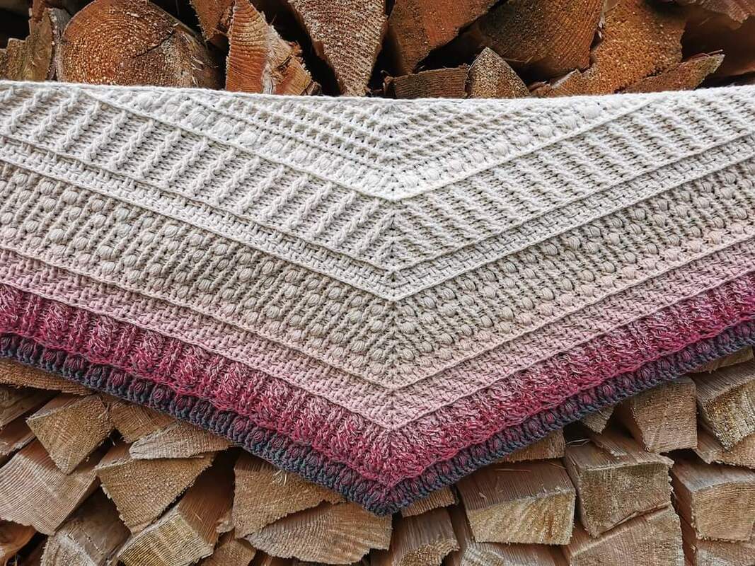 Es kann mit jedem gewünschten Garn gehäkelt werden, ich würde dazu einen Farbverlaufsbobbel mit 1400 m empfehlen. Ich habe für mein Tuch den Bobbel Robina von Kandelas Handarbeitsbox verwendet.
