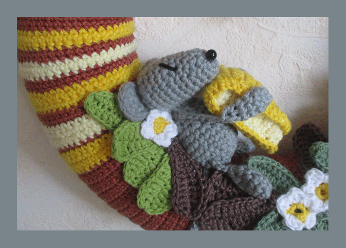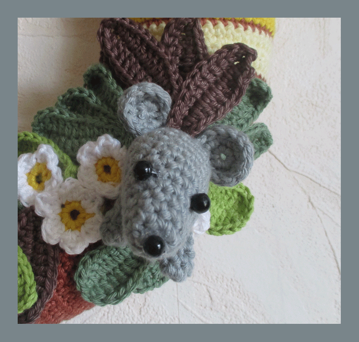 Häkelbaumwolle: 2 x Grau, 1 x Hellgelb, 1x Dunkelgelb, etwas Schwarz, 1x Dunkelgrün, 1 x Hellgrün, 1 x Weiß, 1 x Dunkelbraun
