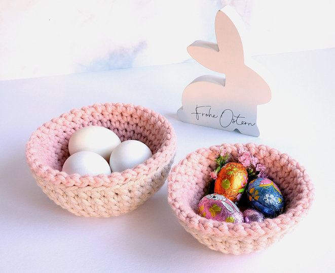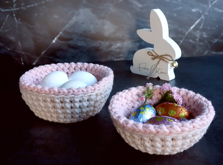 Die Innenkörbe sind jeweils mit festen Maschen gehäkelt, die Außenkörbe mit der Doppelmasche. Durch die Kombination werden die Körbe / Nester sehr stabil, hier hängt bei normaler Befüllung der Boden nicht durch.