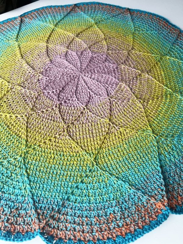 Dahlie wird in Runden von innen nach außen gehäkelt. Das Häkelmuster ist das Motiv einer Dahlie, es entsteht durch die vorderen Reliefstäbchen.