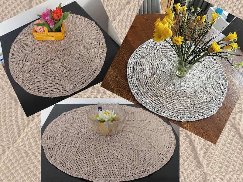 Dahlie wurde mit verschiedenen Materialien getestet, es muss nicht unbedingt mit Filethäkelgarn oder Bobbel gehäkelt werden.