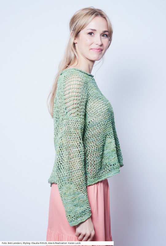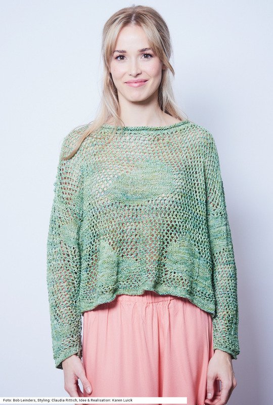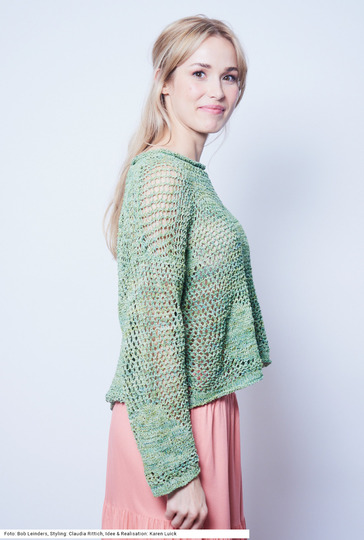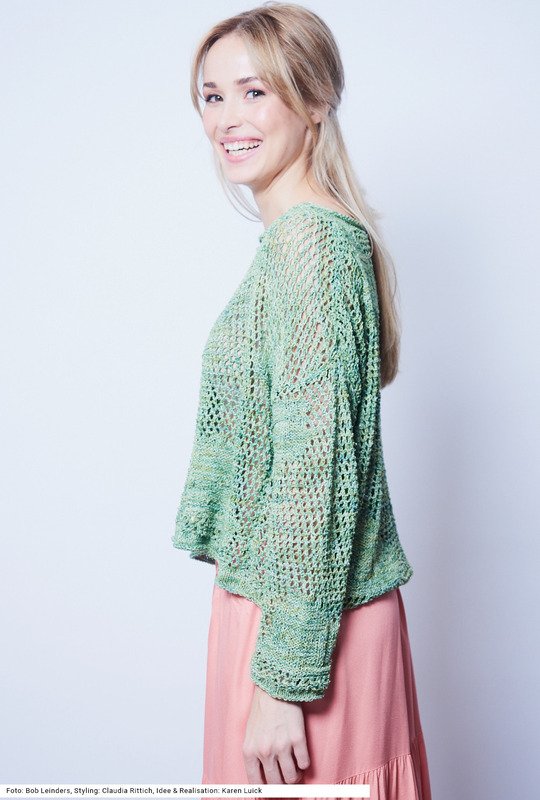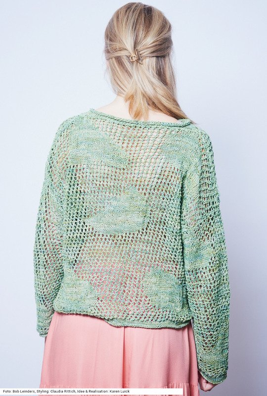 Dieser kastig geschnittene Pulli aus einem grün melierten reinen Seidengarn lässt durch das luftige Netzmuster viel Haut durchblitzen. Die unterschiedlich angeordneten Flecken (stilistisch sollen es Limettenscheiben sein) werden aus rechten und linken Maschen gebildet. Vorder- und Rückenteil sind weit und gerade gearbeitet, die Ärmel beginnen schmal und werden nach oben hin weiter. Alle Blenden werden glatt rechts gestrickt und rollen sich etwas ein. Die Anleitung für dieses Modell gibt es in den Größen 36 – 40, 42 – 46 und 48 – 52.