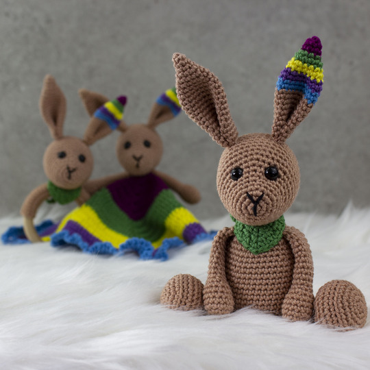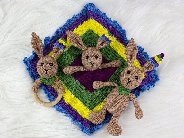 Die Anleitung ist ein Kombipaket für den Hasen als Kuscheltier, Greifring und Schmusetuch. Die Anleitungen gibt es auch einzeln.