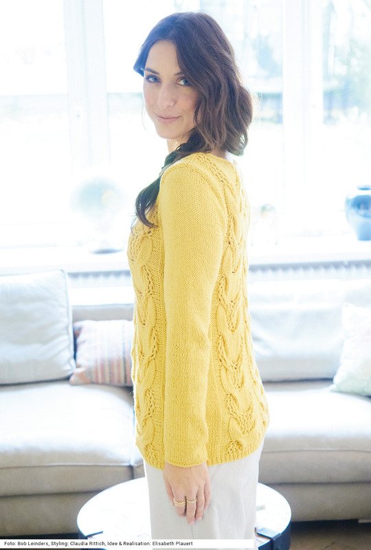 Bei diesem Pullover steht das Ajour-Zopfmuster ganz klar im Mittelpunkt, der Rest des Modells ist schlicht glatt rechts. Zwischen den Tulpenzöpfen, die als Besonderheit mit je einem Strang glatt rechts und einem Strang Lochmuster gebildet werden, verlaufen glatt linke Streifen. Der flach-runde Halsausschnitt sorgt dafür, dass die Schulterpartie besonders betont wird, die dank der Armkugeln auch perfekt sitzt. Durch die raffinierte Zusammensetzung aus Baumwolle, Schurwolle und Polyamid ist das verwendete gelbe Bändchengarn wunderbar weich und pillingarm – noch dazu kann es im Schonwaschgang gewaschen werden. Eine Anleitung gibt es für die Größen 36/38, 40/42 und 44/46.