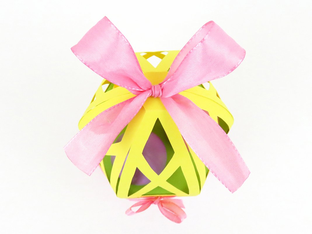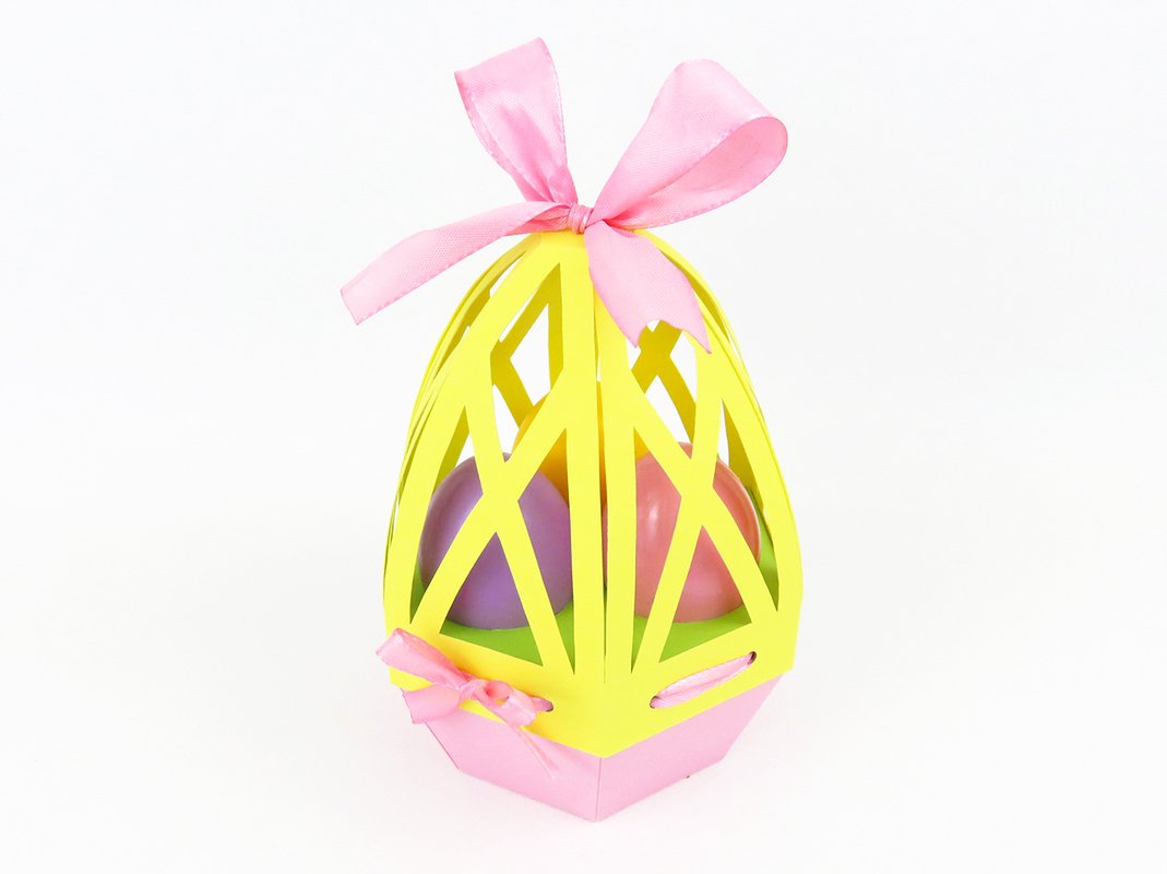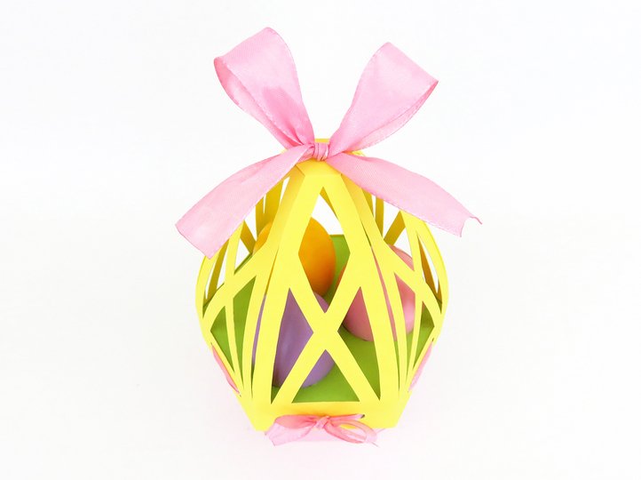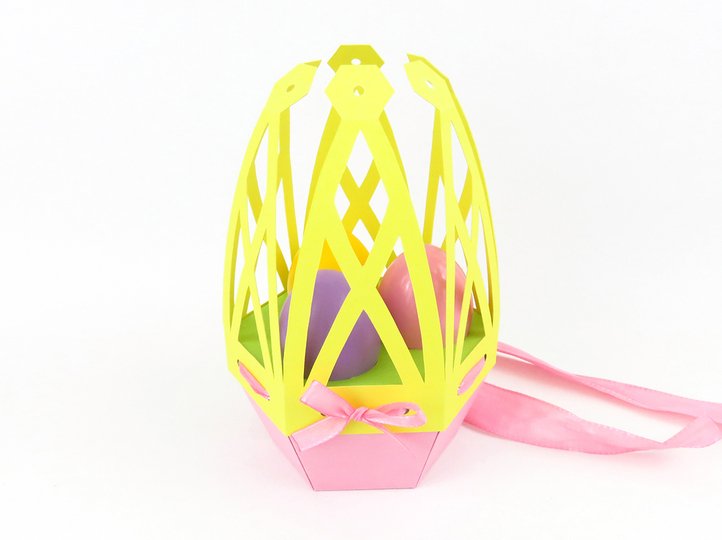 Diese stilvolle Tragetasche ist eine ausgefallene Verpackung für Ostergeschenke. Sie bietet Platz für (selbst)dekorierte Ostereier oder Schokoeier in ähnlicher Größe und beinhaltet außerdem ein verstecktes Fach für kleine Süßigkeiten oder andere Überraschungsgeschenke.