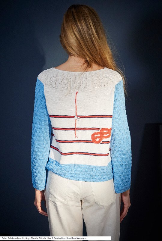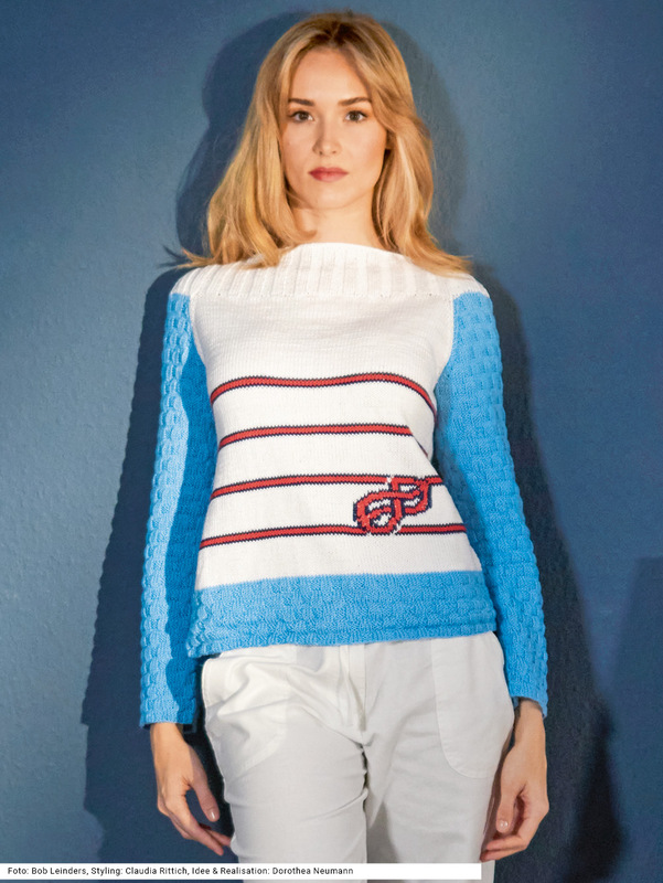 Ein Raglanpulli mit besonderer Schnittführung: kurze Raglanschrägen und breite Ärmelenden. Aus reiner Baumwolle gearbeitet, genau das Richtige für5 Frühling und Sommer. Ein aufgestickter Seemannsknoten gibt dem weißen Vorder- und Rückenteil mit schmalen roten und marineblauen Streifen einen maritimen Charakter. Die hellblauen Ärmel sind im Karomuster aus rechten und linken Maschen gearbeitet, genauso wie der Bund. Ansonsten wird glatt rechts und die Passe im Rippenmuster gestrickt. Der runde Halsausschnitt ist etwas breiter. Eine Anleitung kann für die Größen 36/38, 40/42 und 44/46 downgeloadet werden.