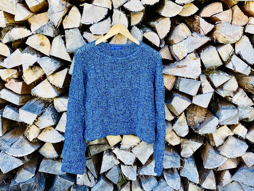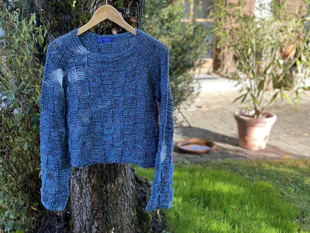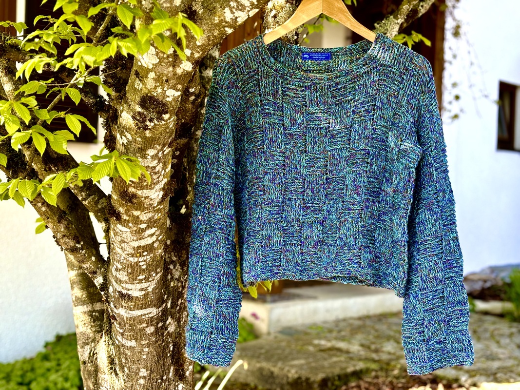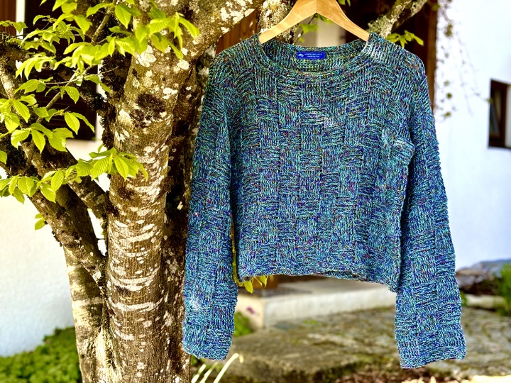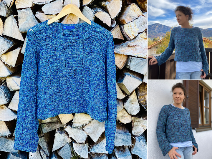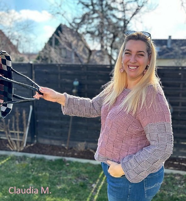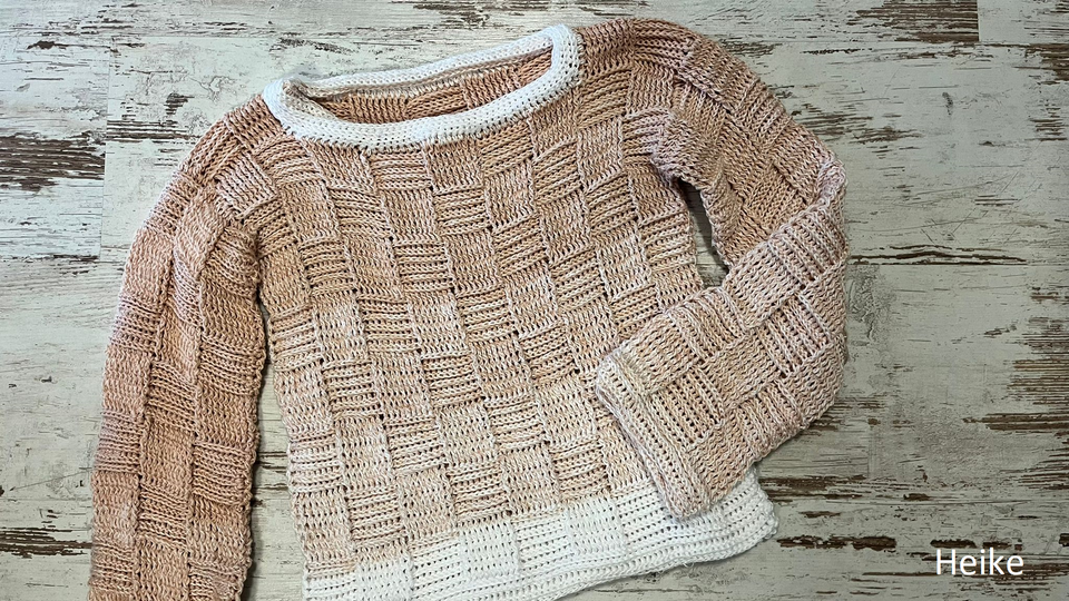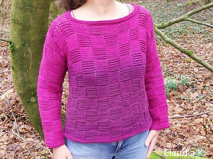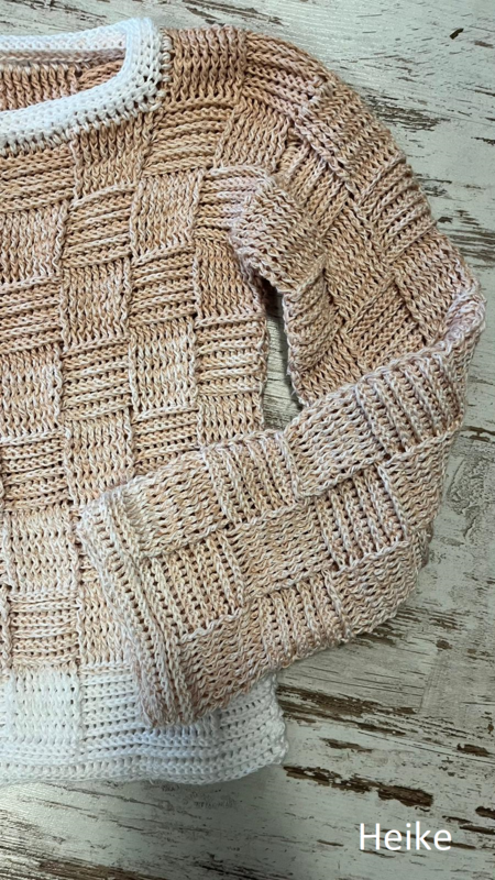 Der Sweater wird nahtlos von oben nach unten im Schachbrettmuster gehäkelt, zuerst in Reihen, danach in Runden. Die Ärmel werden angehäkelt und ebenfalls in Runden gearbeitet.